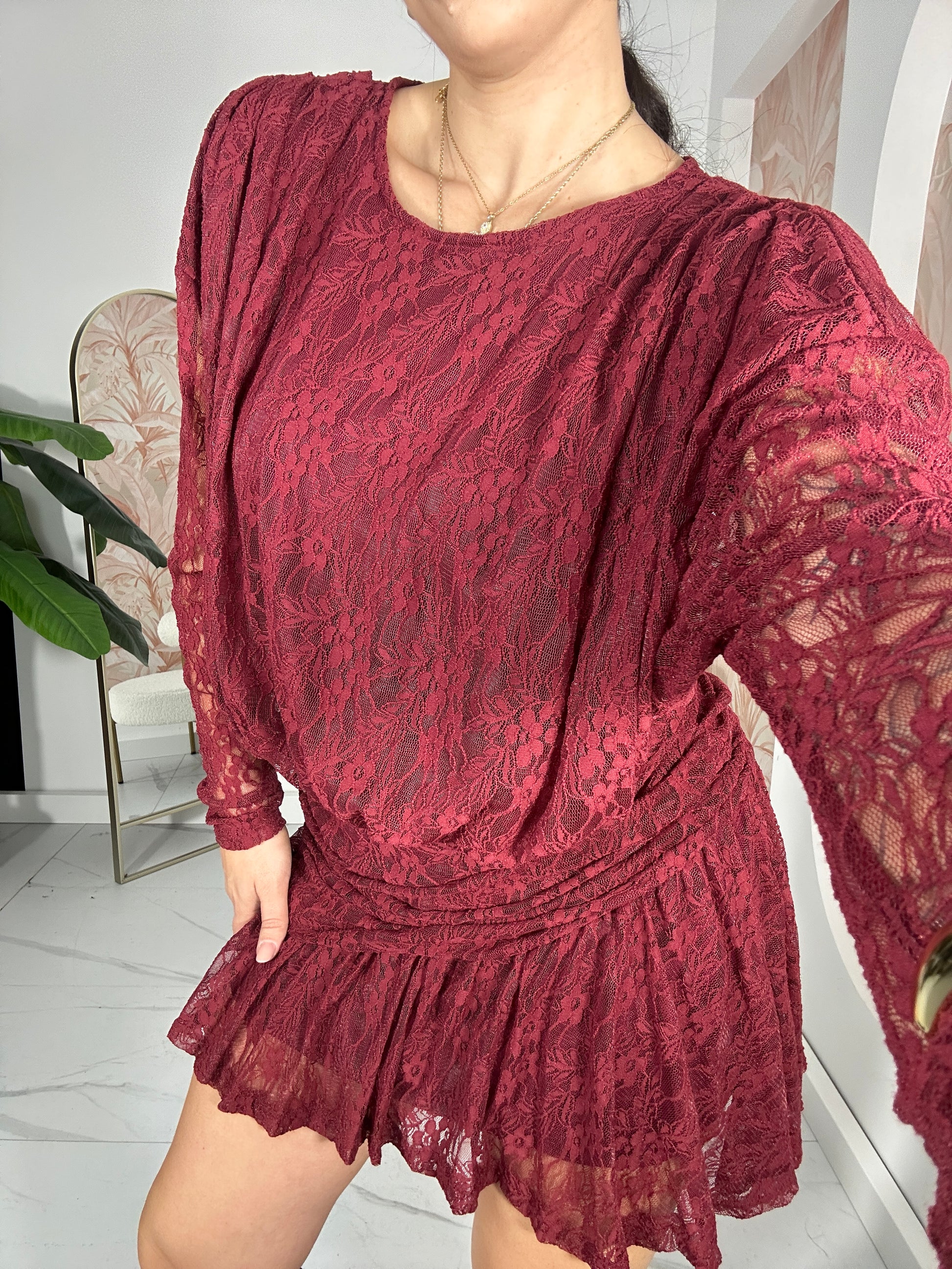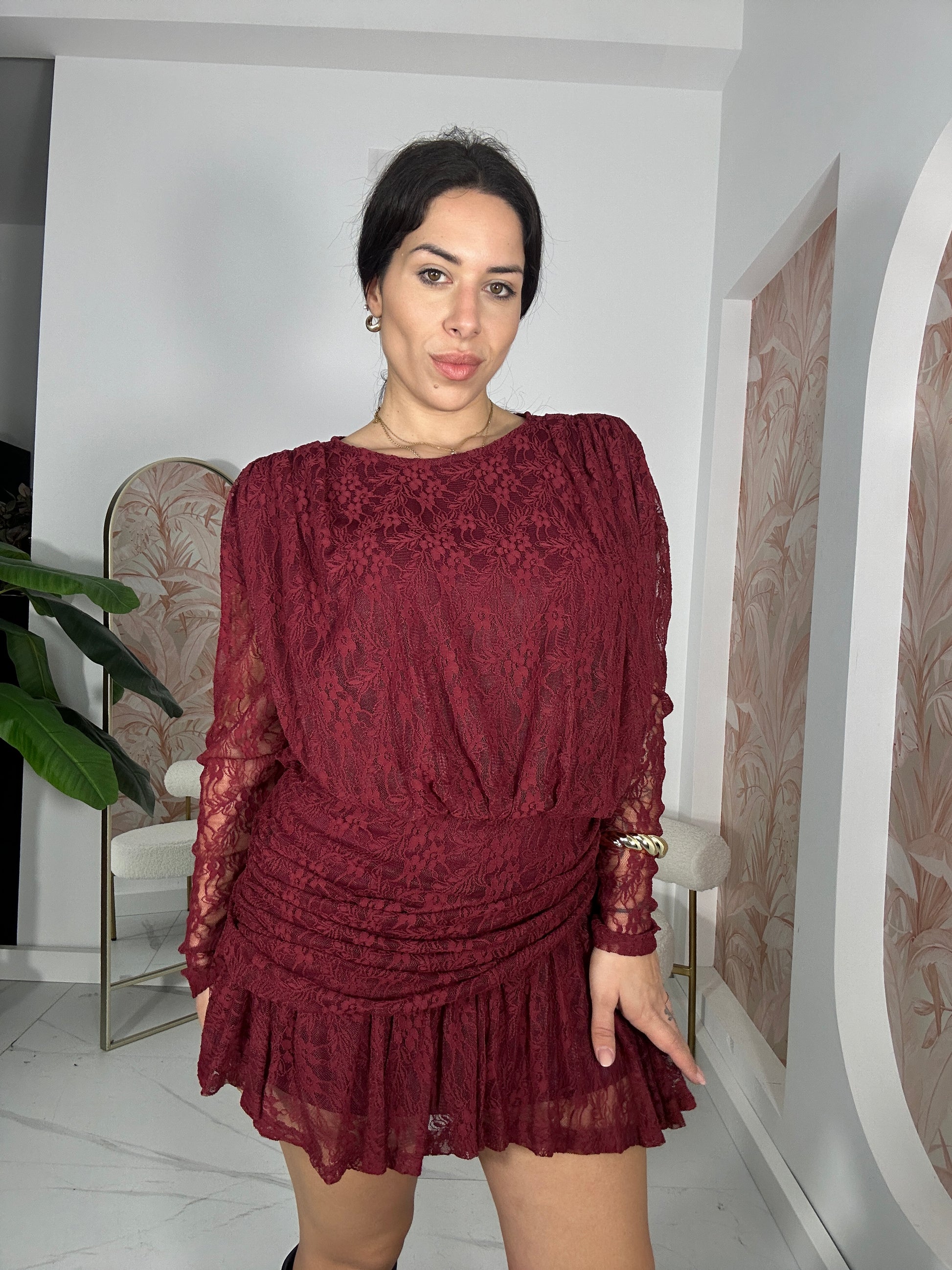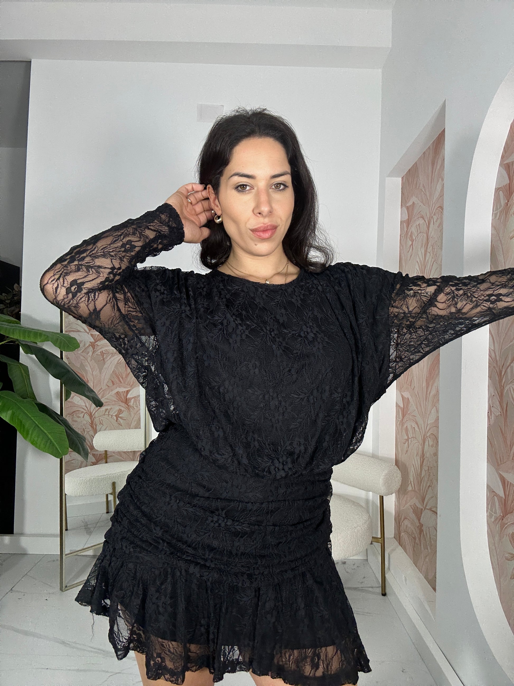 Abito in pizzo manica lunga con elastico in vita e gonna morbida.