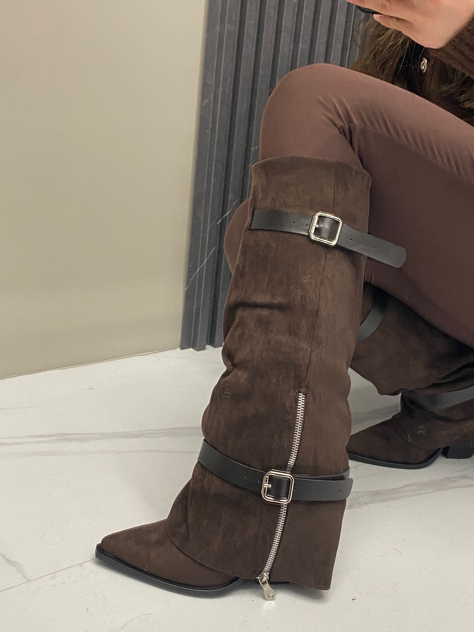Stivale camperos in camoscio con fibbie . Altezza tacco 9 cm.