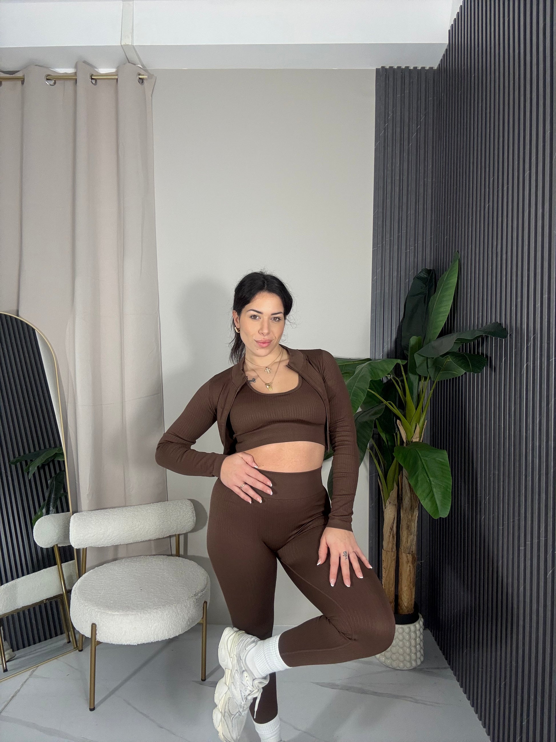 Coordinato fitness 3 pezzi giacca manica lunga, top con coppe sul seno e leggings con drappeggio sul retro.