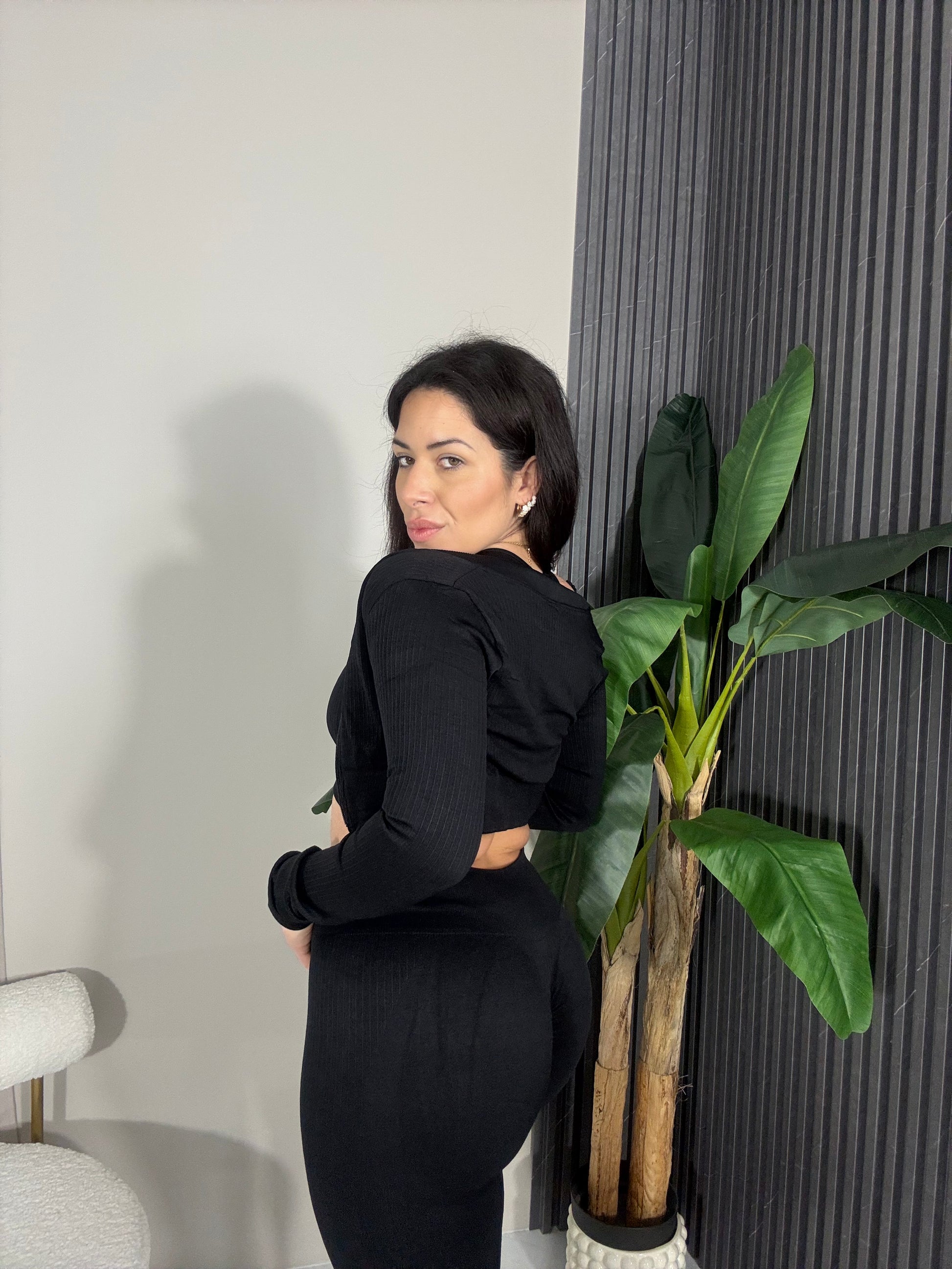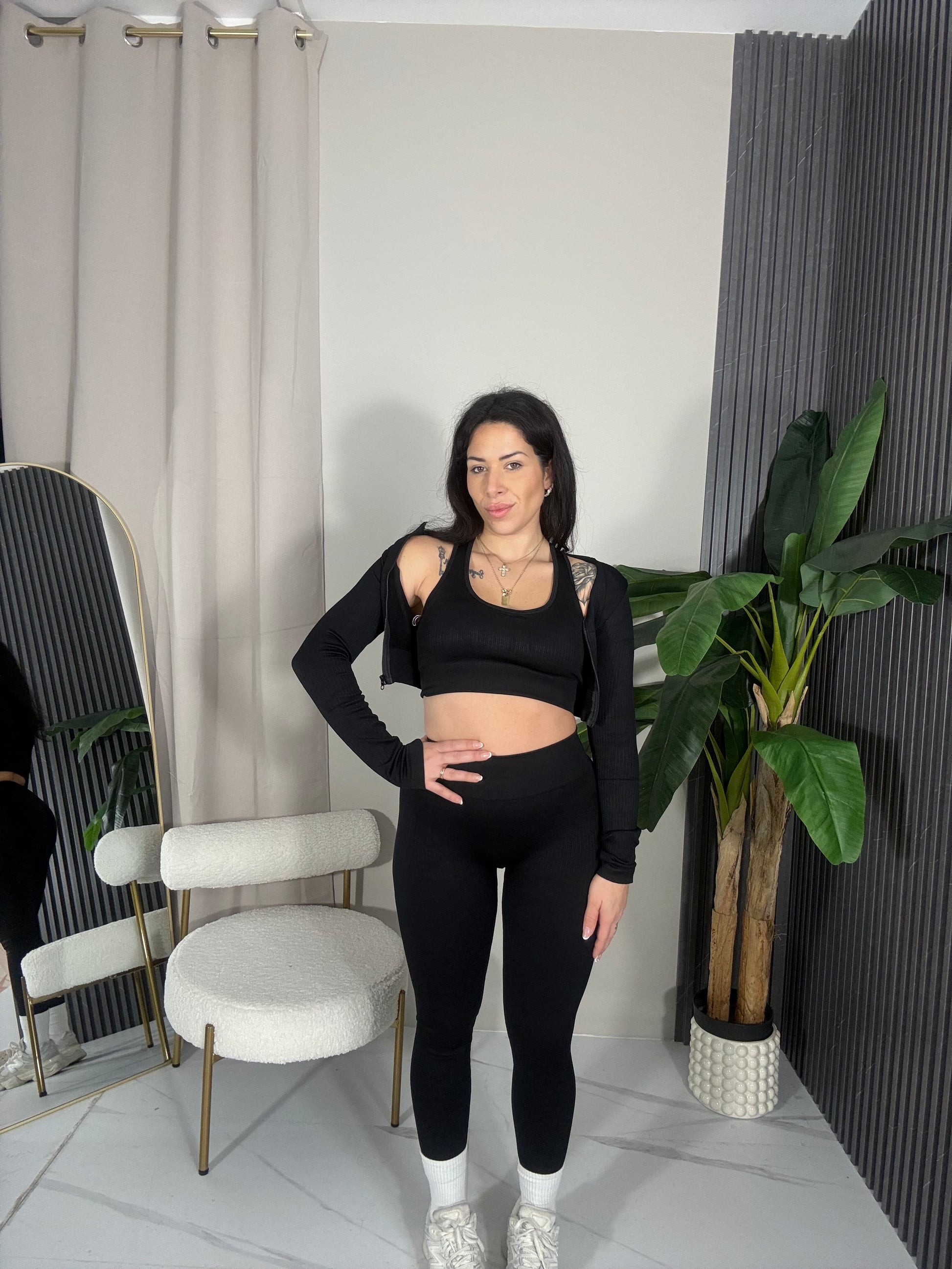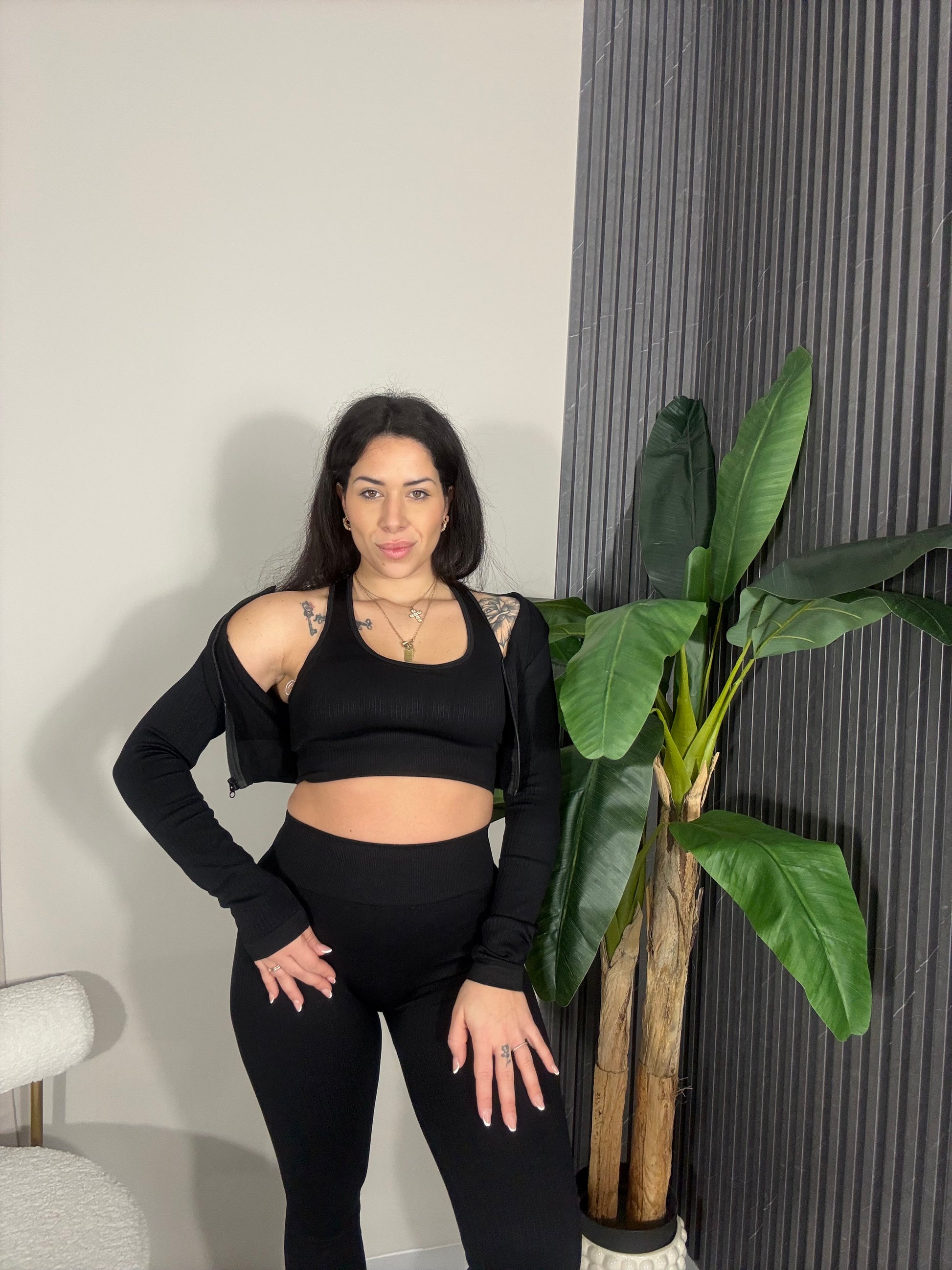 Coordinato fitness 3 pezzi giacca manica lunga, top con coppe sul seno e leggings con drappeggio sul retro.