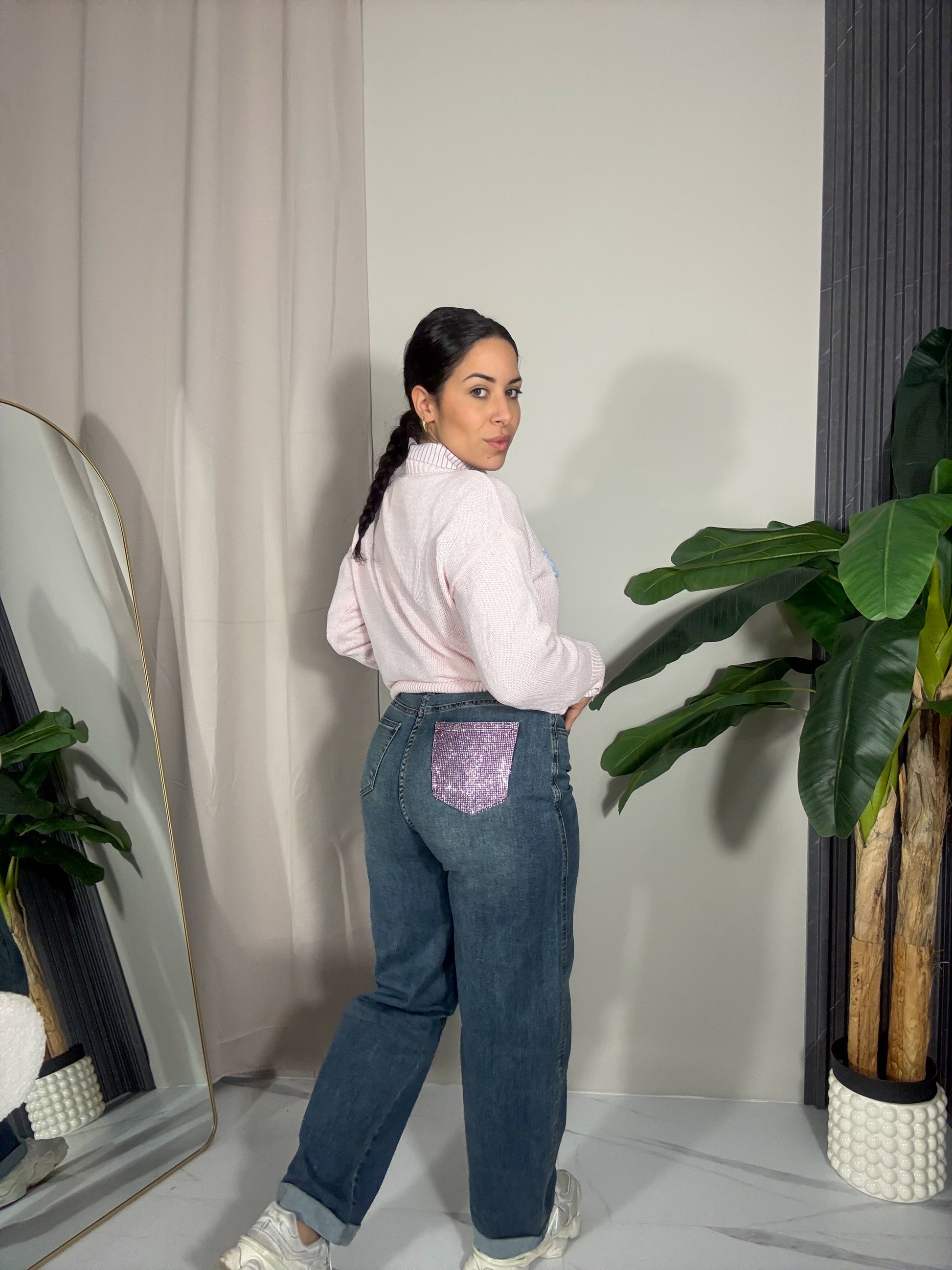 Jeans a vita alta elasticizzato sul retro ha un taschino ricoperto di strass rosa.