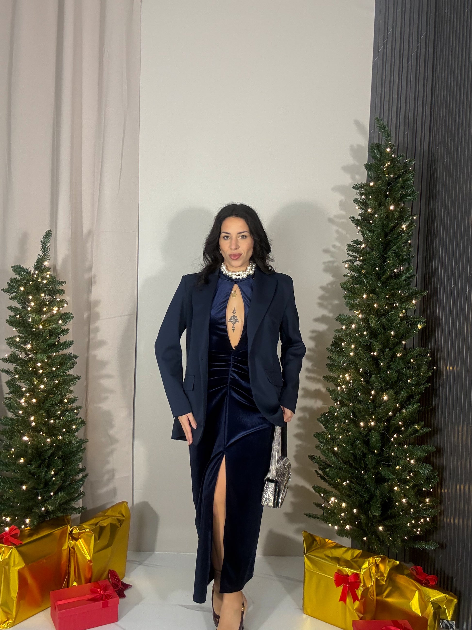 Abito lungo in velluto con spacco sul davanti.