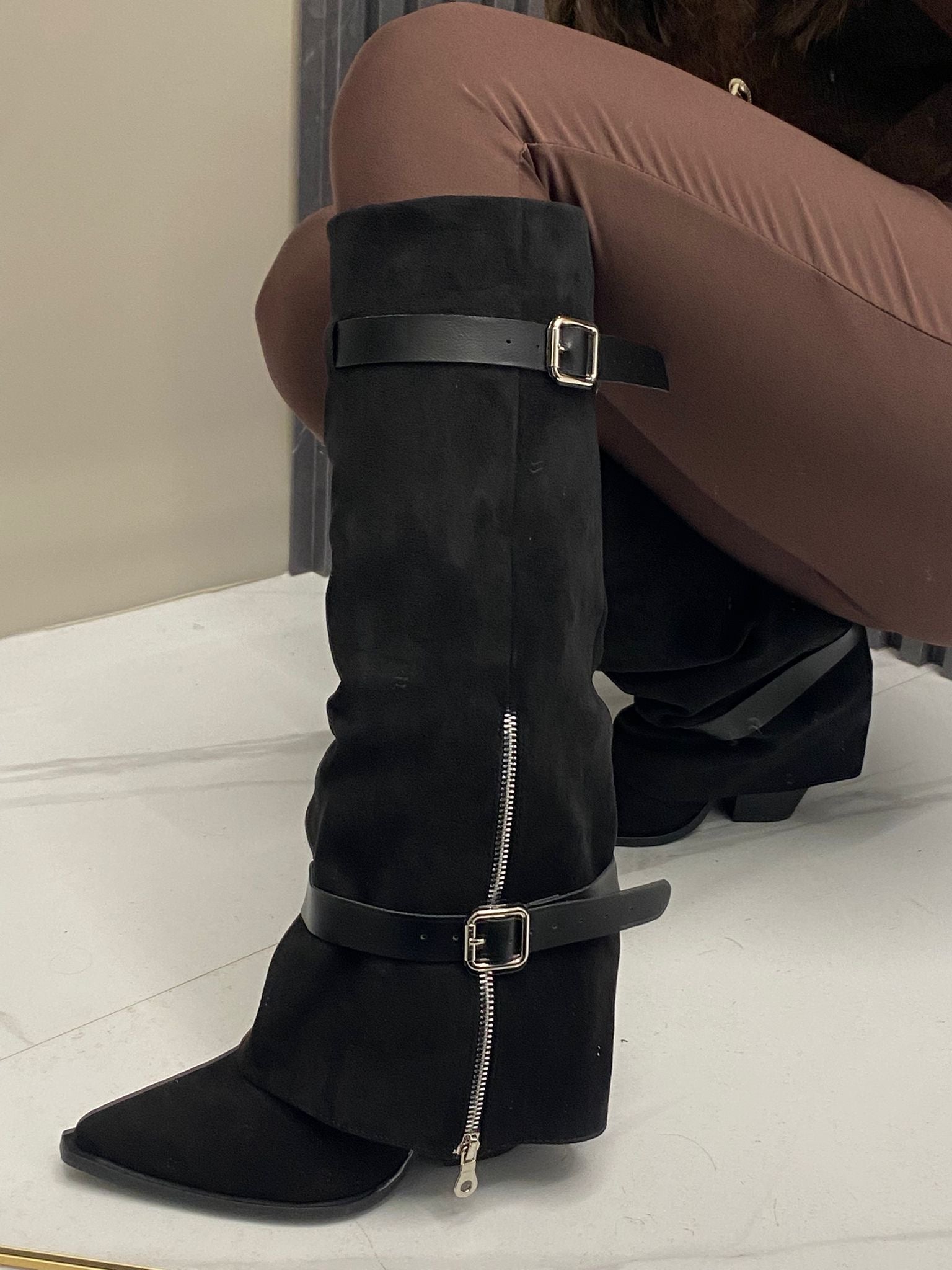 Stivale camperos in camoscio con fibbie . Altezza tacco 9 cm.
