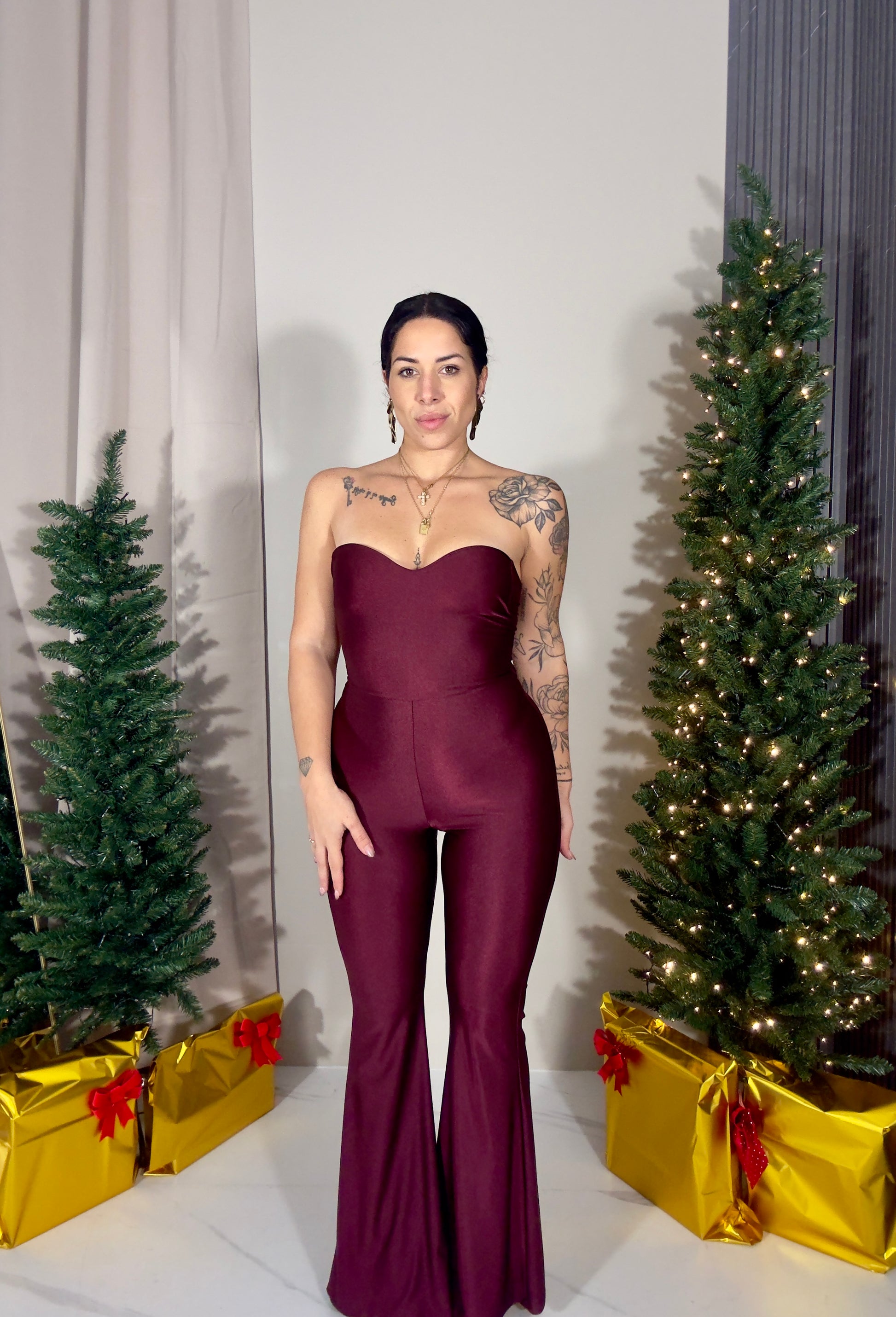 Tuta intera elasticizzata in tessuto laminato. La parte superiore ha lo scollo a cuore e una scollatura profonda sul retro, mentre la parte sottostante ha il pantalone aderente a zampa.