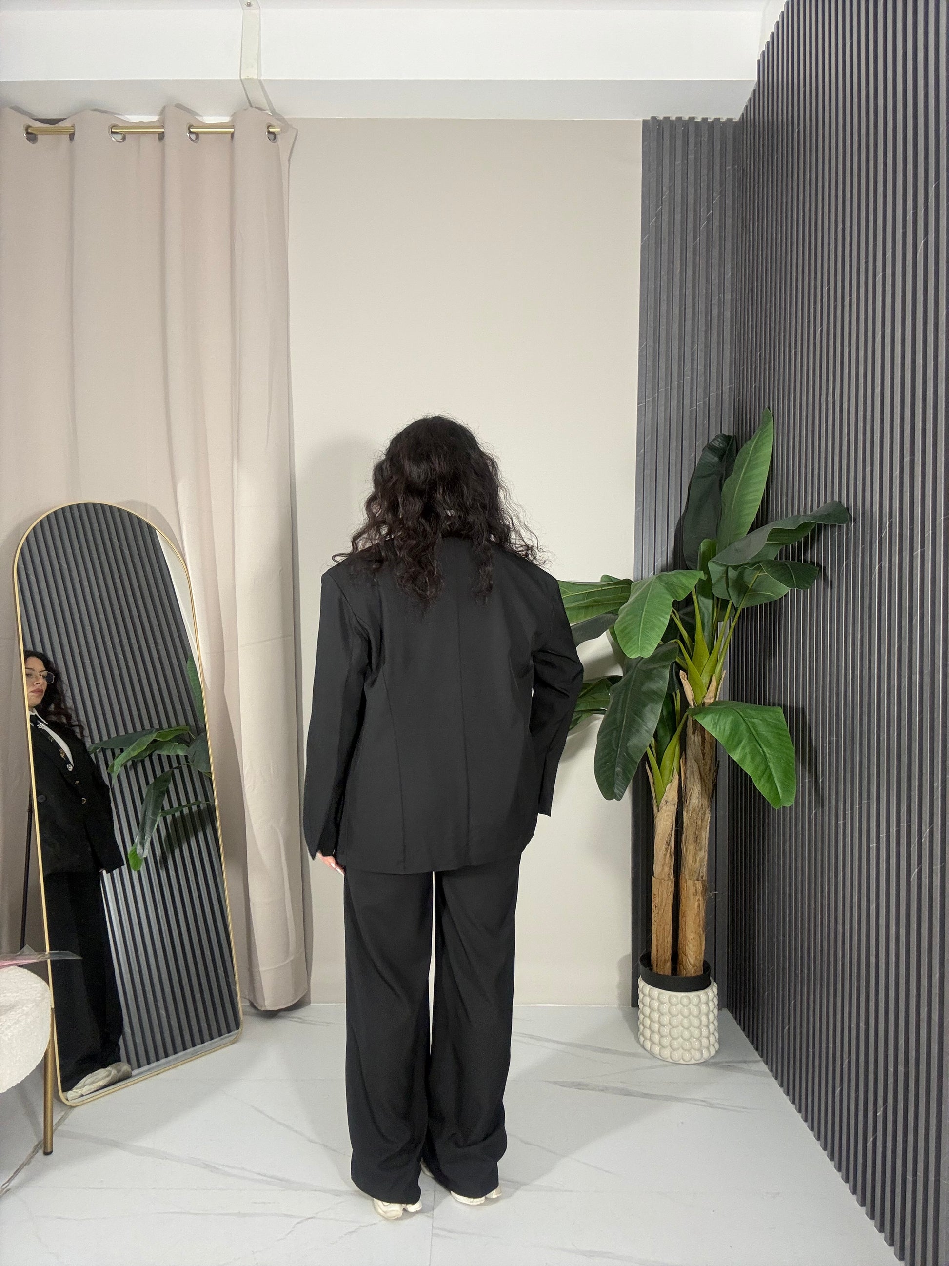 Completo elegante composto da giacca oversize dal taglio sartoriale e pantalone dritto con bottone frontale ed elastico sul retro per una vestibilità comoda e versatile. Un look raffinato e moderno, perfetto sia per occasioni formali che per outfit più casual chic.