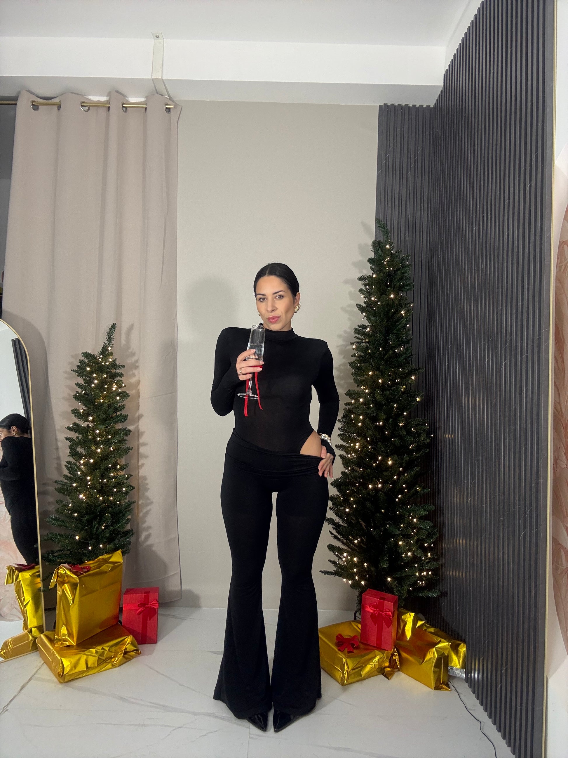 Tuta intera elasticizzata con manica lunga e spacco sul fianco.