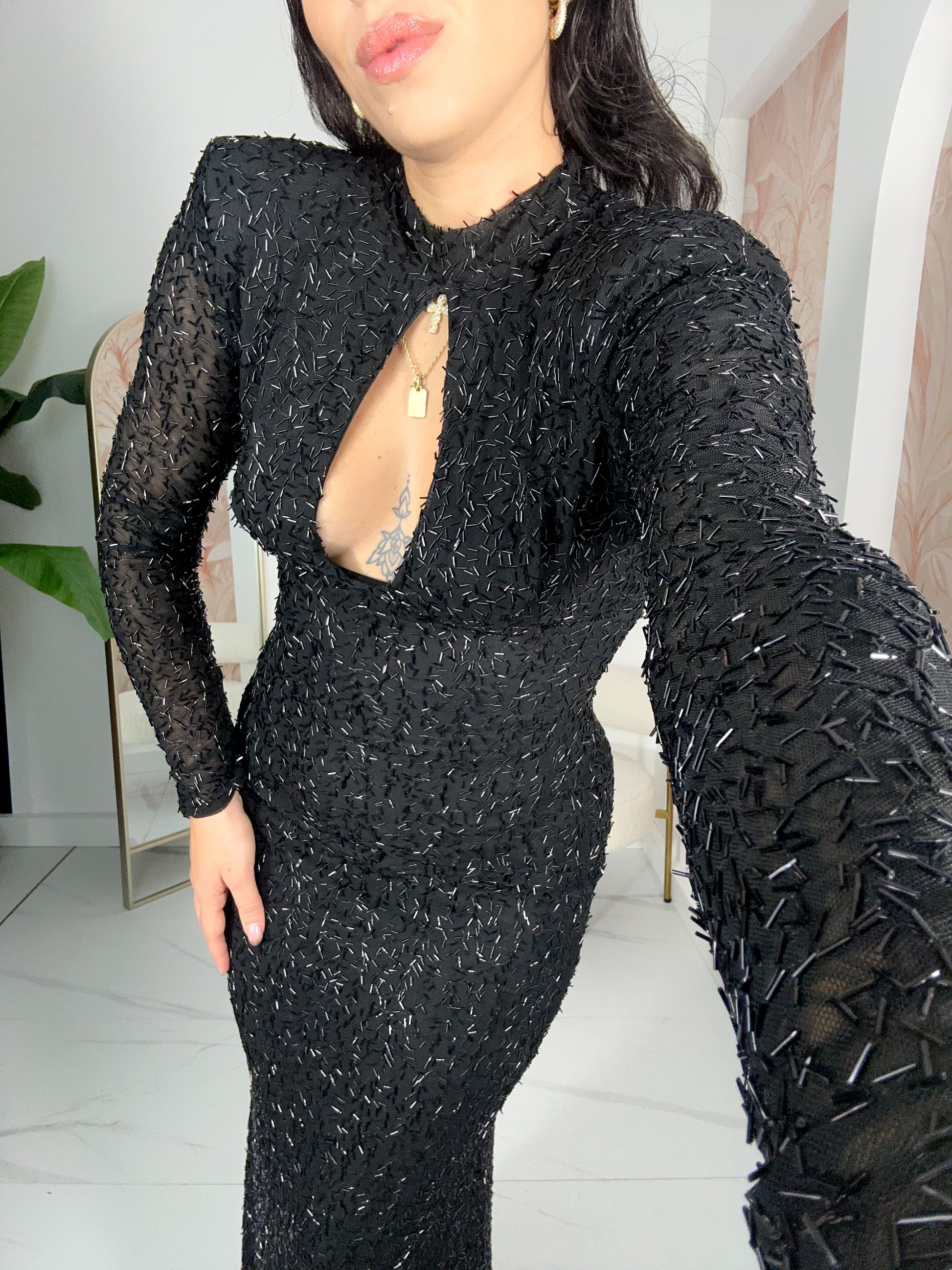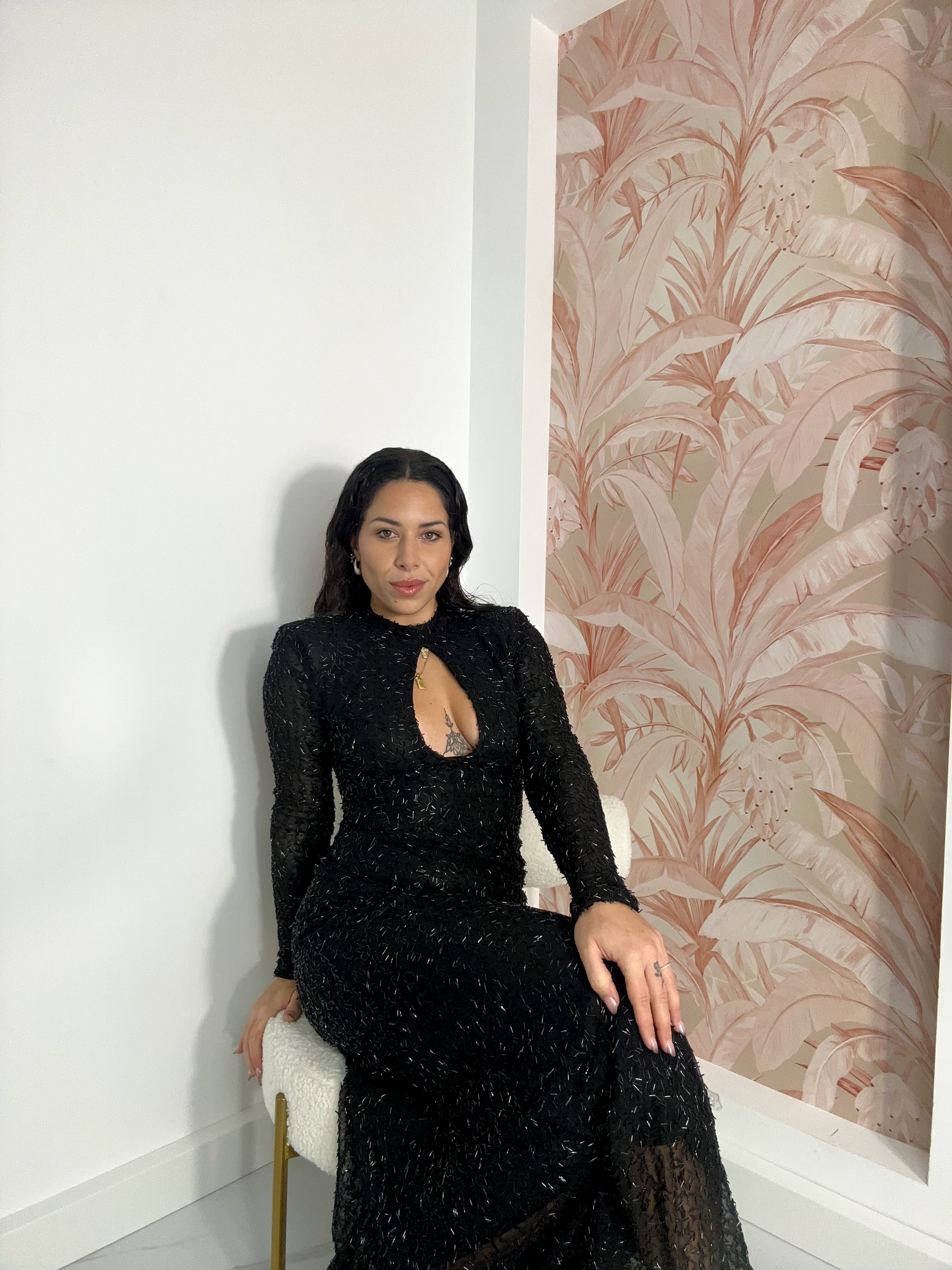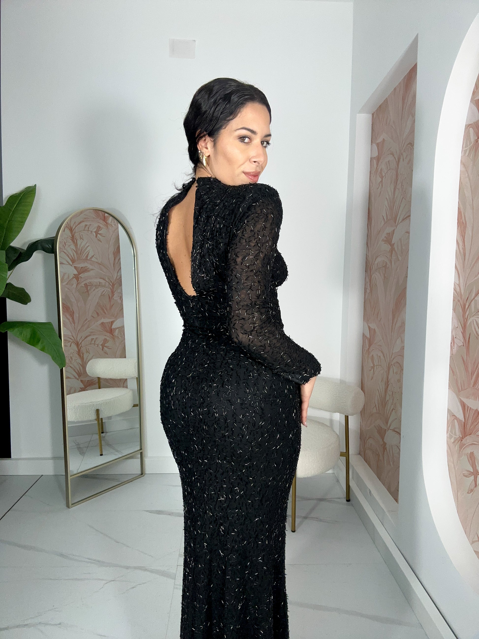 L’abito è un modello elastico in taglia unica, pensato per adattarsi armoniosamente a diverse forme del corpo.