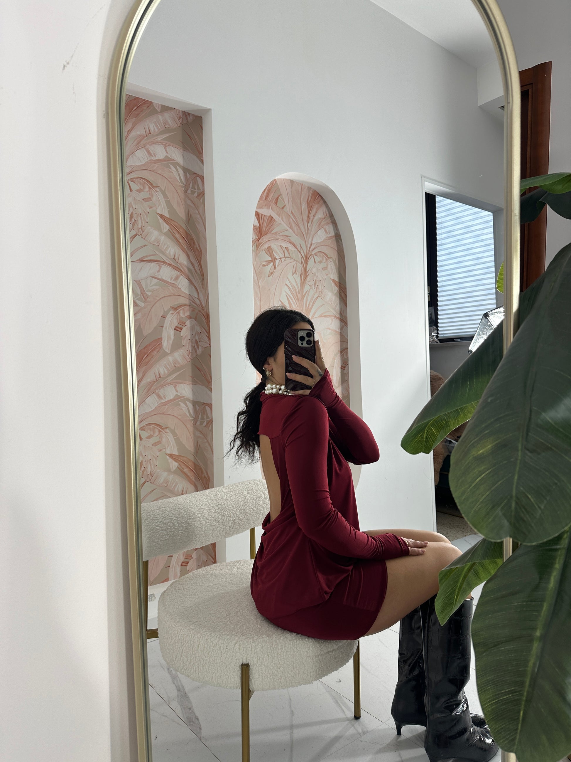 La particolarità è la schiena scoperta con drappeggio morbido, che aggiunge un tocco di eleganza e femminilità. Davanti presenta una linea semplice con collo alto e maniche lunghe aderenti, perfetto per bilanciare la profondità dello scollo posteriore. Il tessuto elasticizzato garantisce comfort e una vestibilità impeccabile, adattandosi facilmente a diverse fisicità.