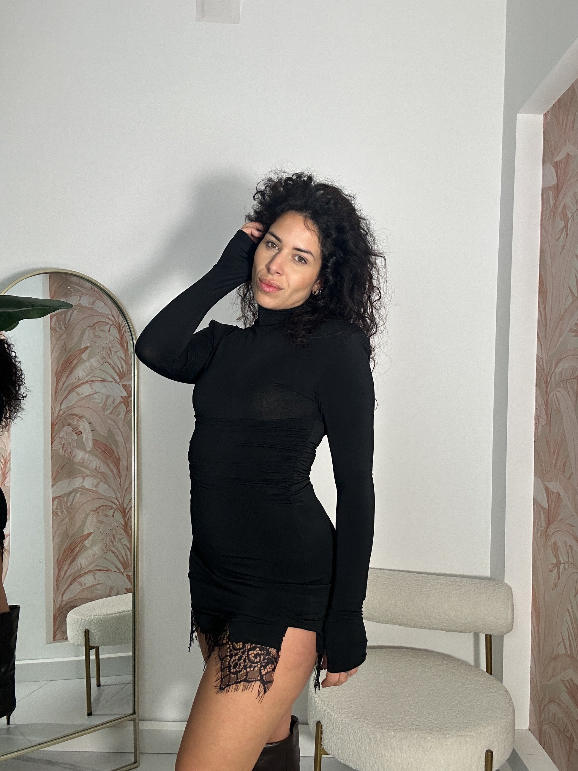 Abito accollato corto elasticizzato con inserti in pizzo. La manica è lunga modello a guanto .