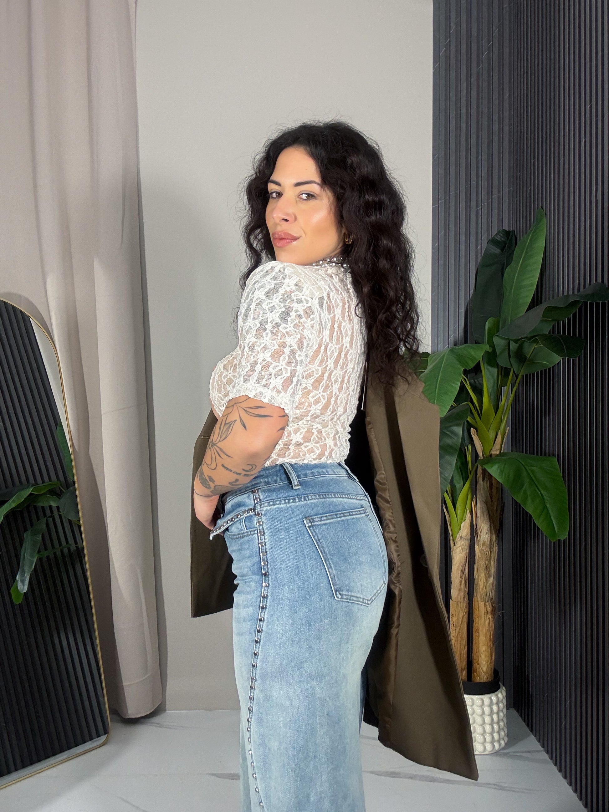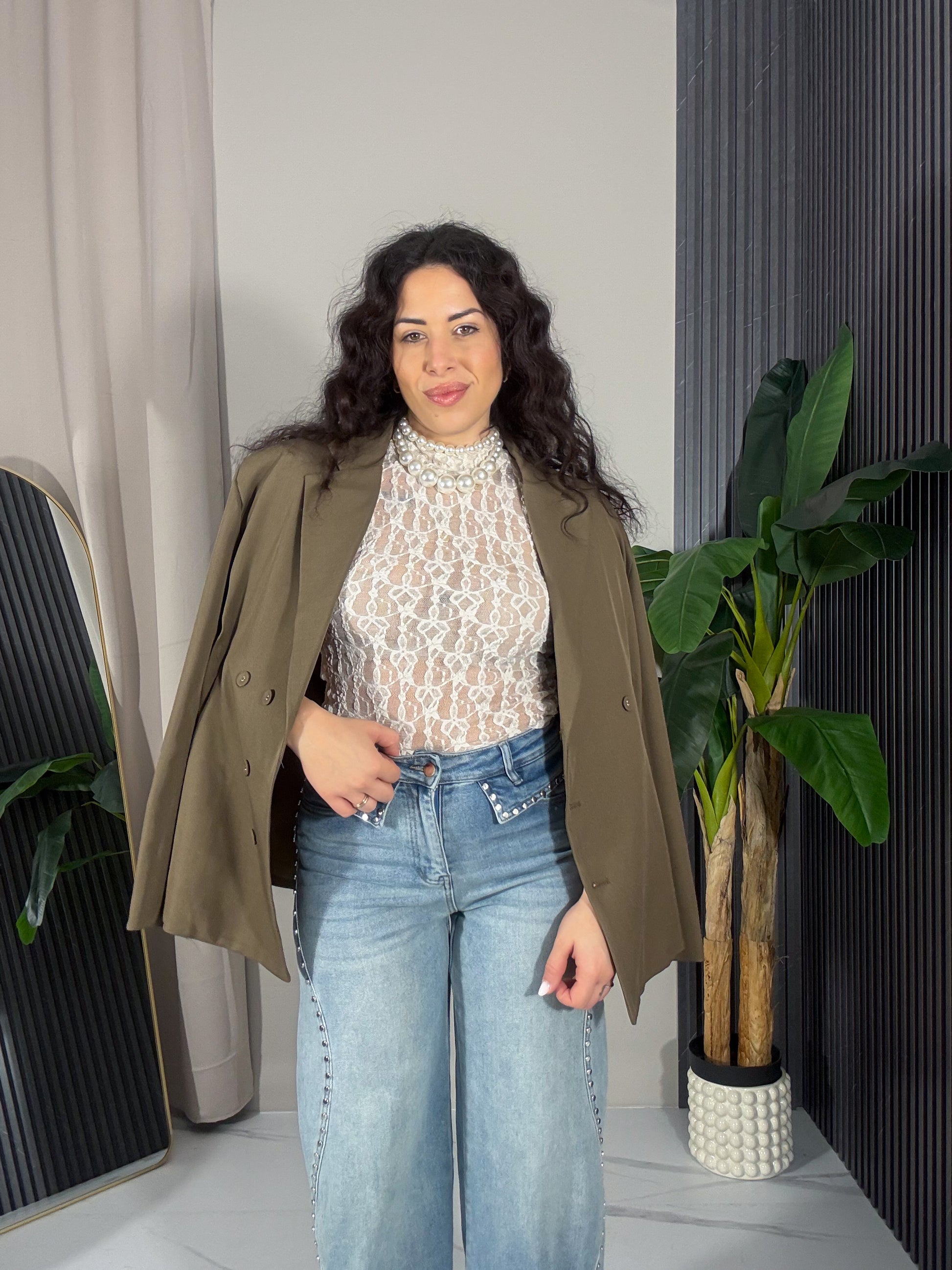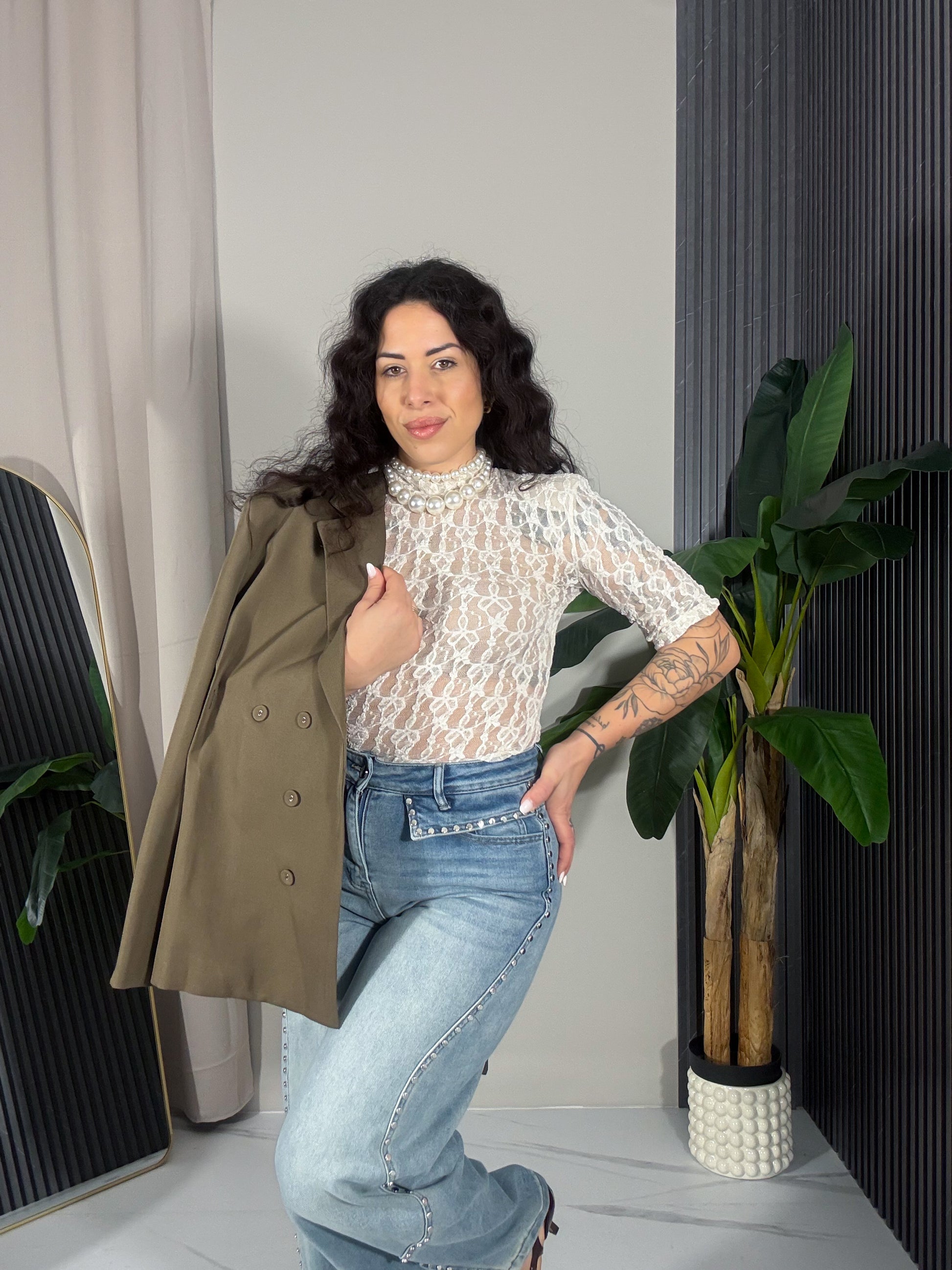 body aderente elasticizzato con ricamo a fiori a manica corta con spallina imbottita.