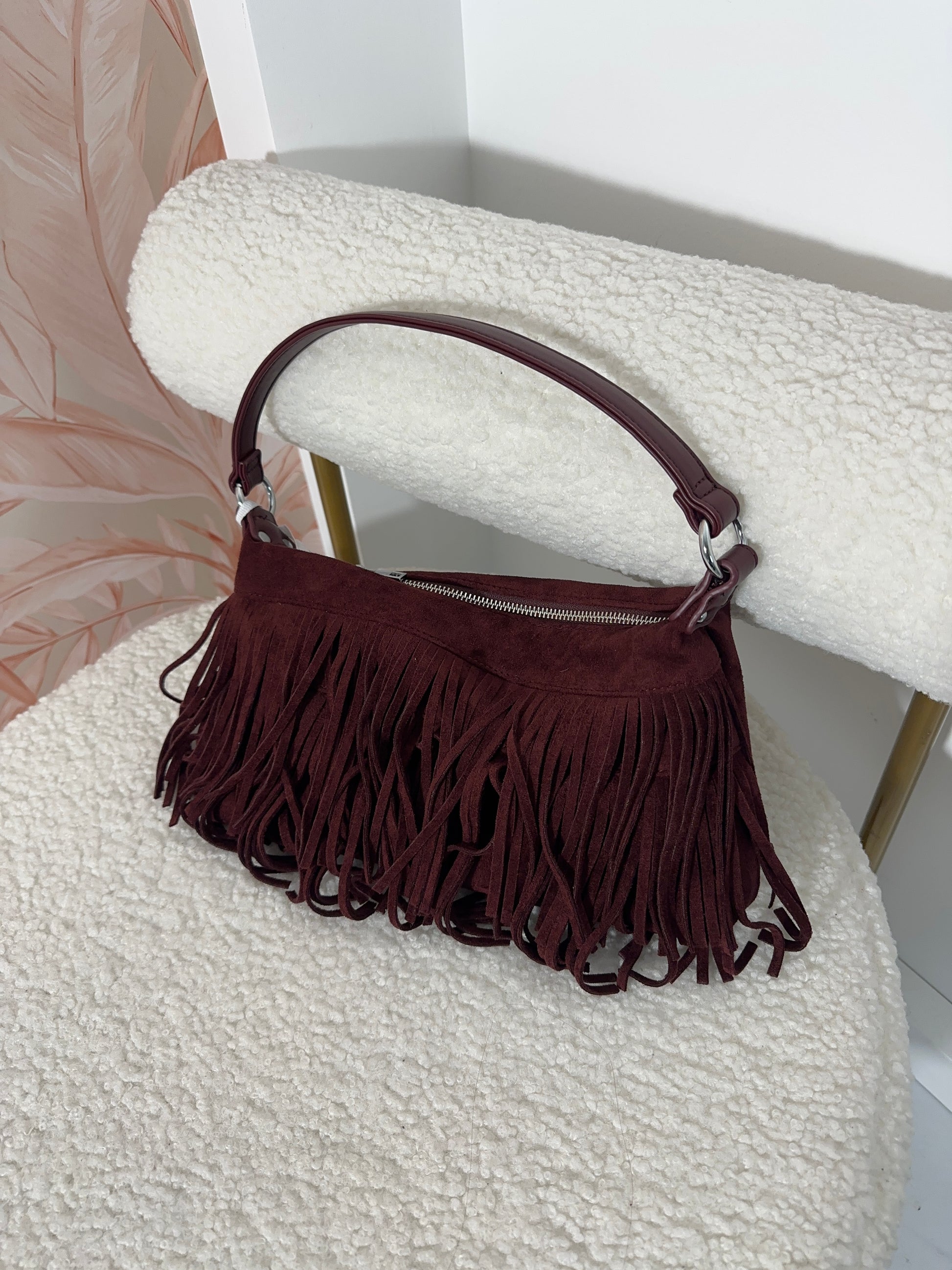 Borsa con manico e tracolla all’Interno, in camoscio con frange.