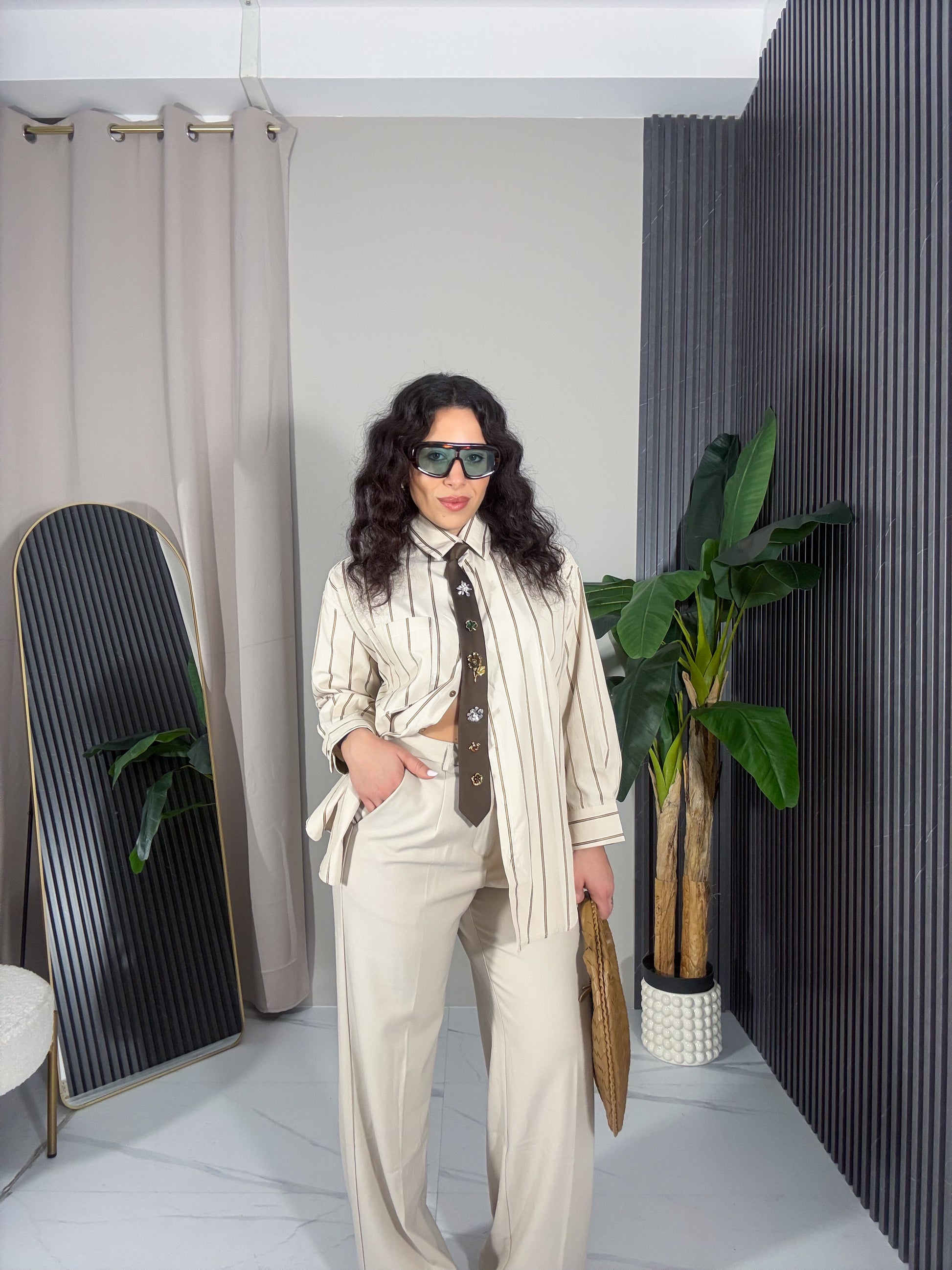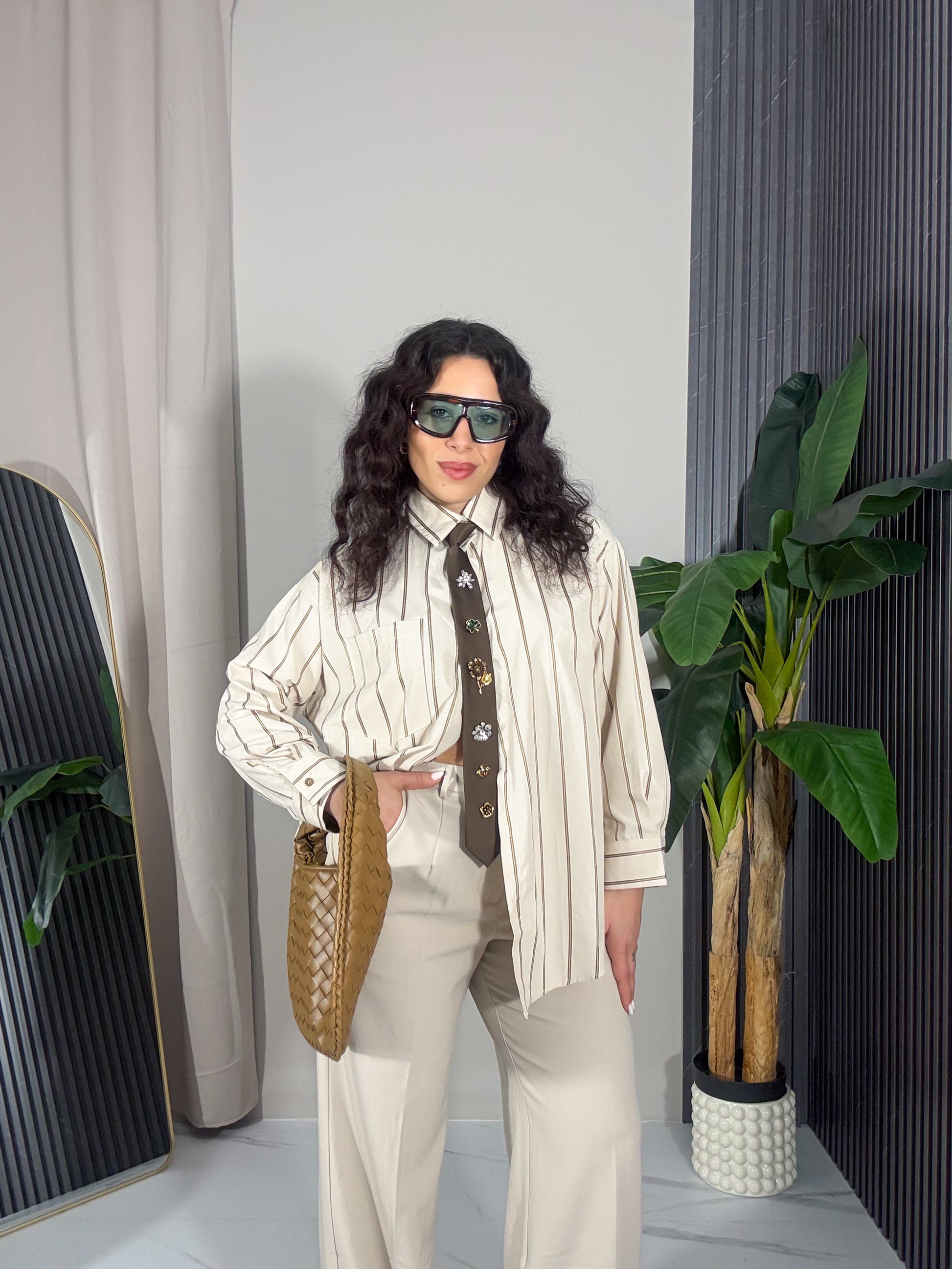 Camicia modello over dal taglio morbido e rilassato, perfetta per un look casual ma ricercato. Realizzata in tessuto leggero e confortevole, presenta una delicata fantasia a righe verticali sui toni neutri che slancia la figura e la rende facile da abbinare.