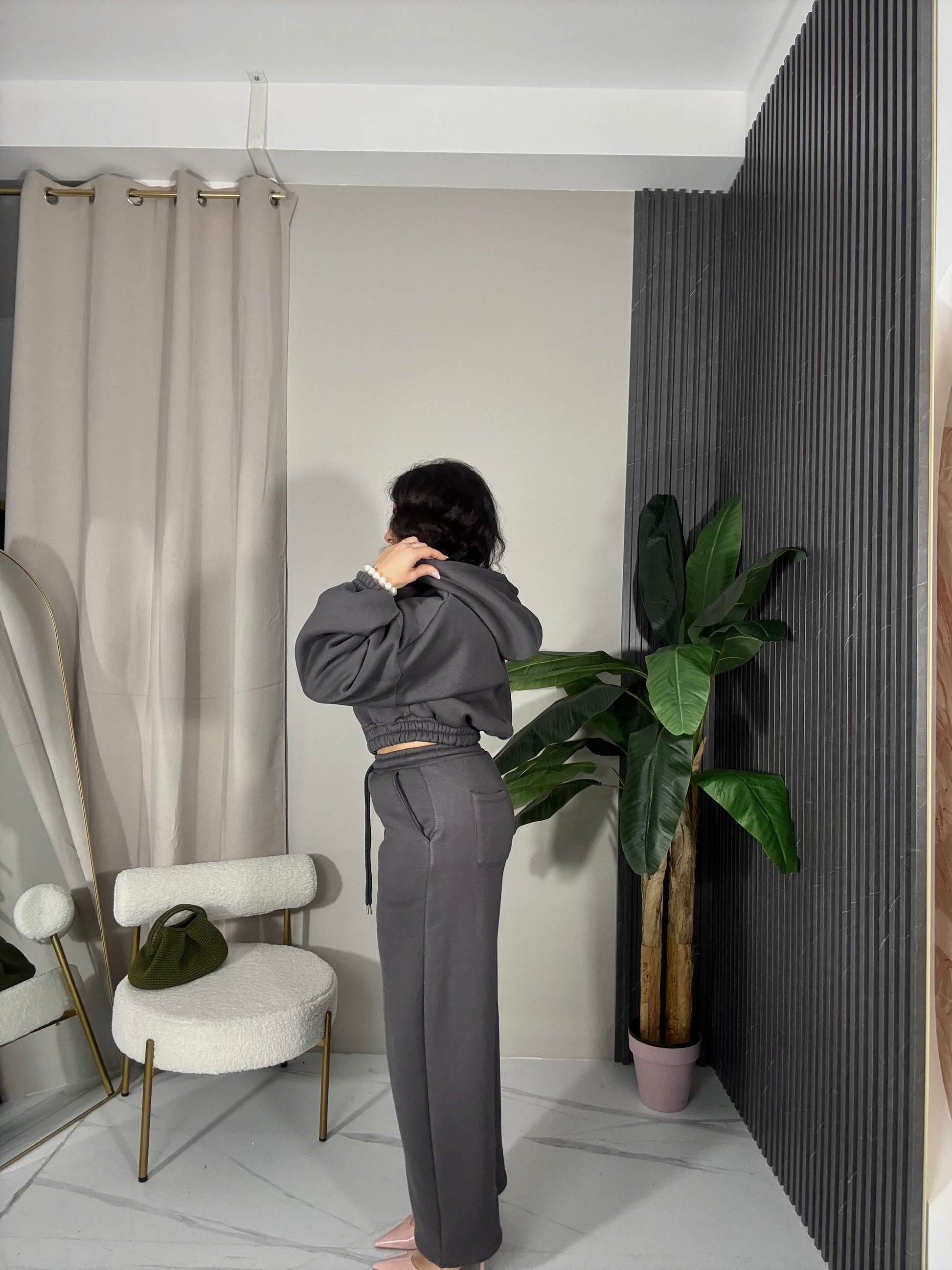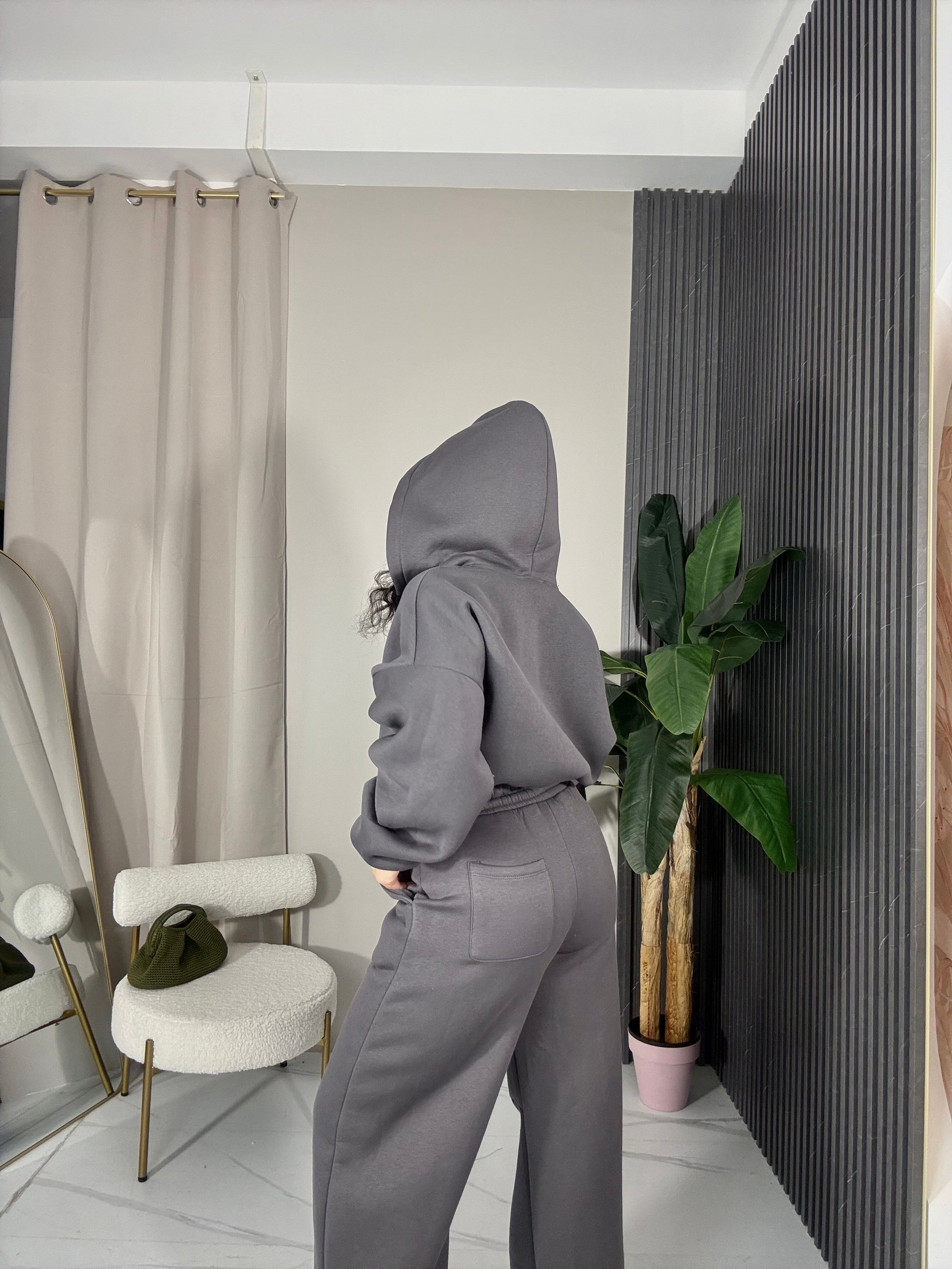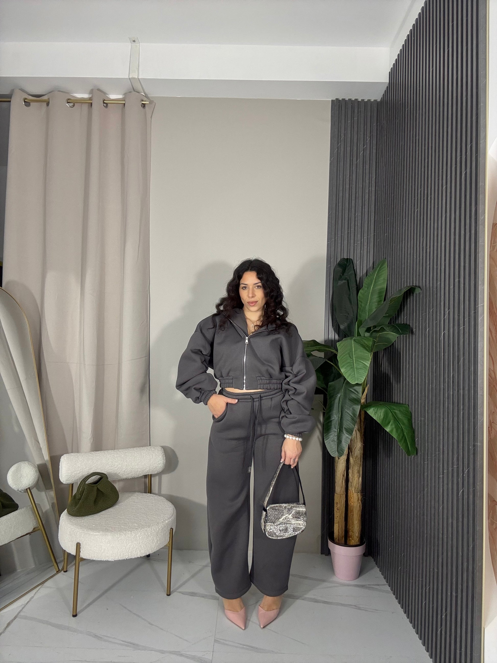 Completo due pezzi tuta felpata all’interno. La felpa è over corta con drappeggi9 sulle maniche e cappuccio. Il pantalone con elastico in vita.