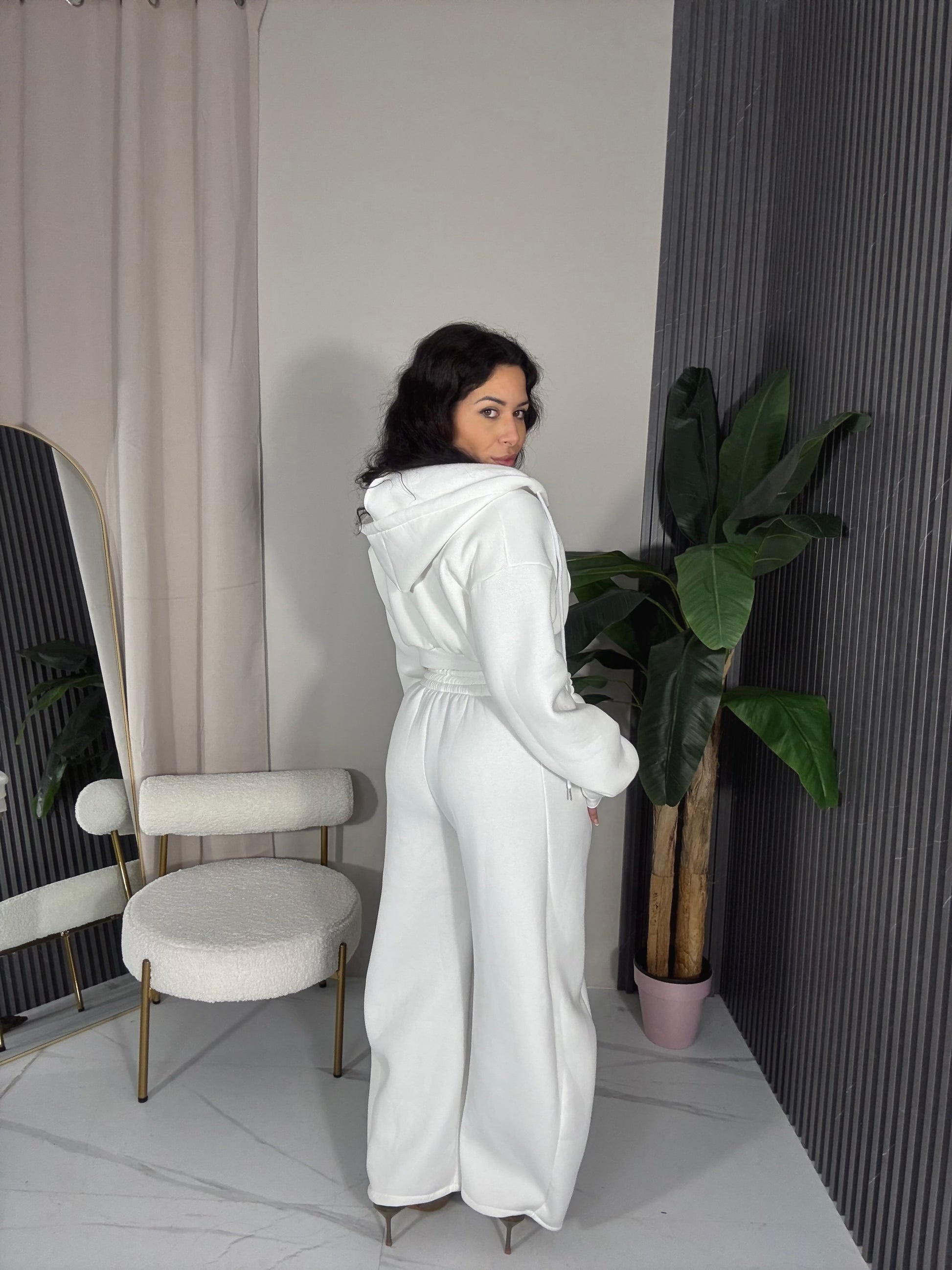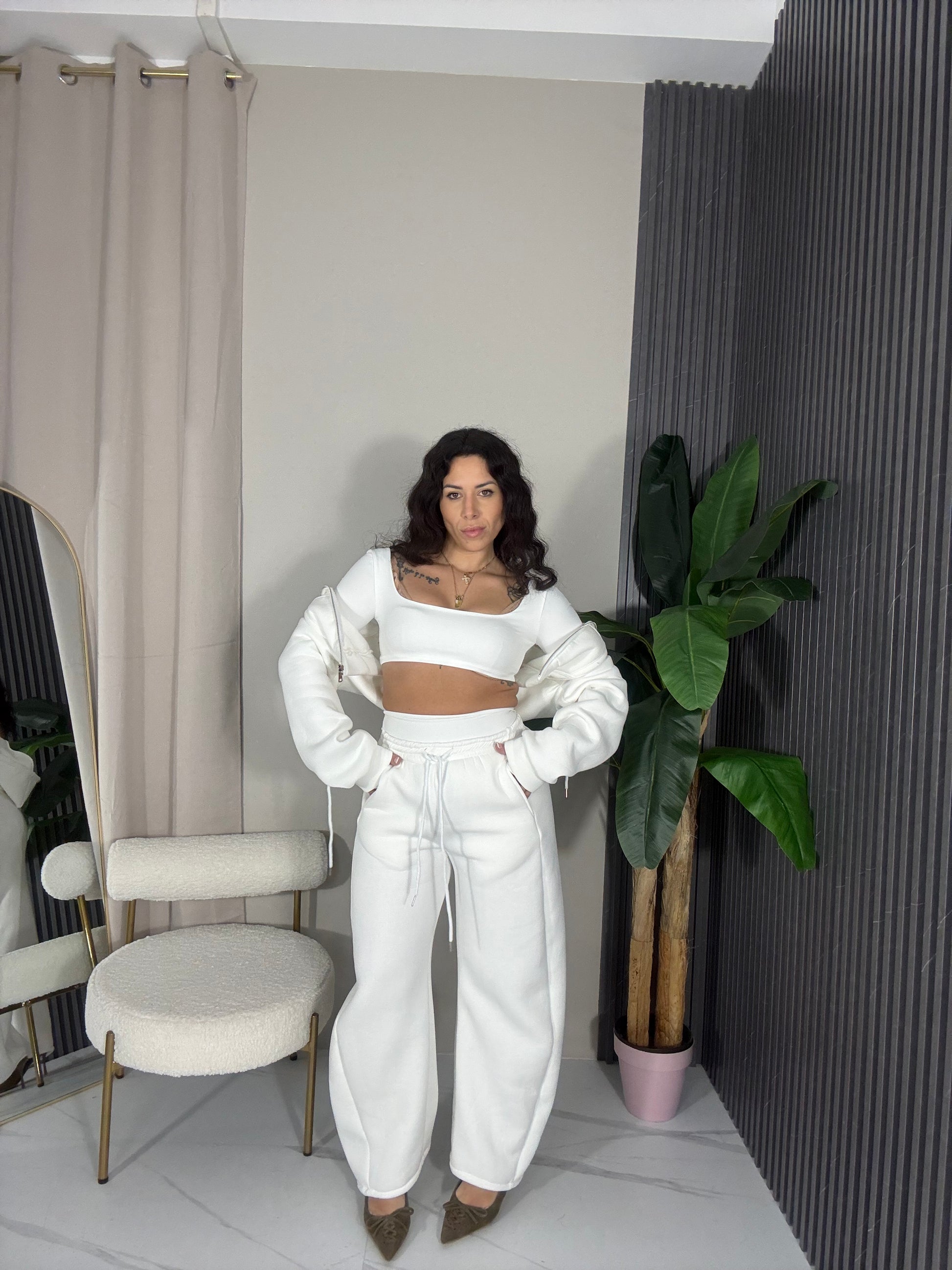 Completo tuta 3 pezzi pantalone balloon con elastico in vita, top corto elasticizzato con manica lunga a manicotto e felpa Ciro con cerniera e cappuccio.