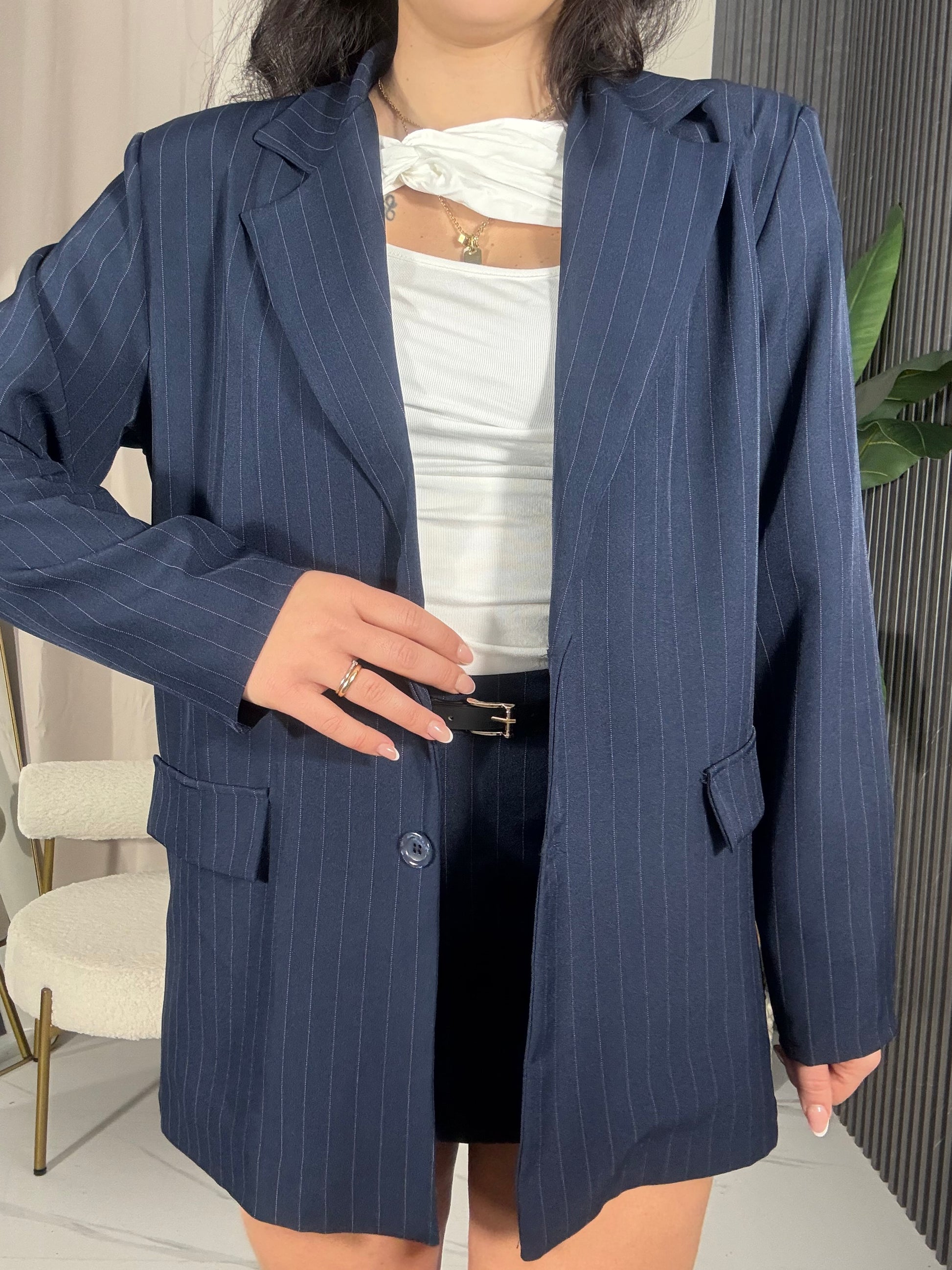 Coordinato due pezzi in gessato blu nave con blazer over con spalline imbottite e un bottone, e Pantagonna con cinta ed elastico sul retro.