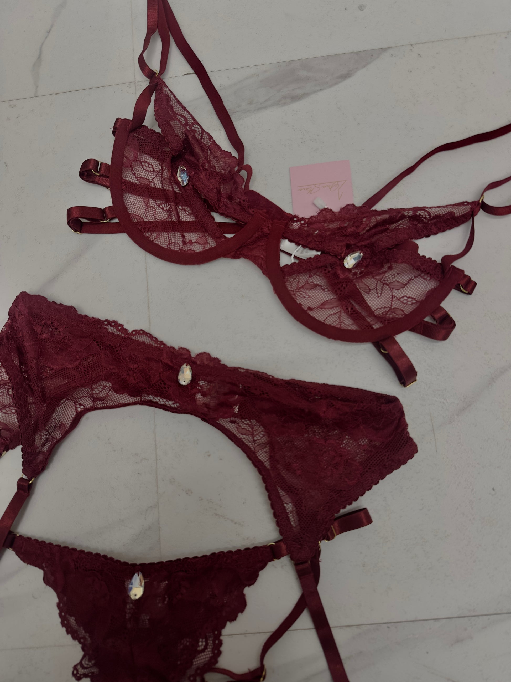 Coordinato in pizzo con dettagli diamantati, composto da reggiseno in pizzo con ferretti senza coppe, che valorizza naturalmente il décolleté. Il set include reggicalze abbinati e perizoma coordinato, per un look sensuale, luminoso e sofisticato.