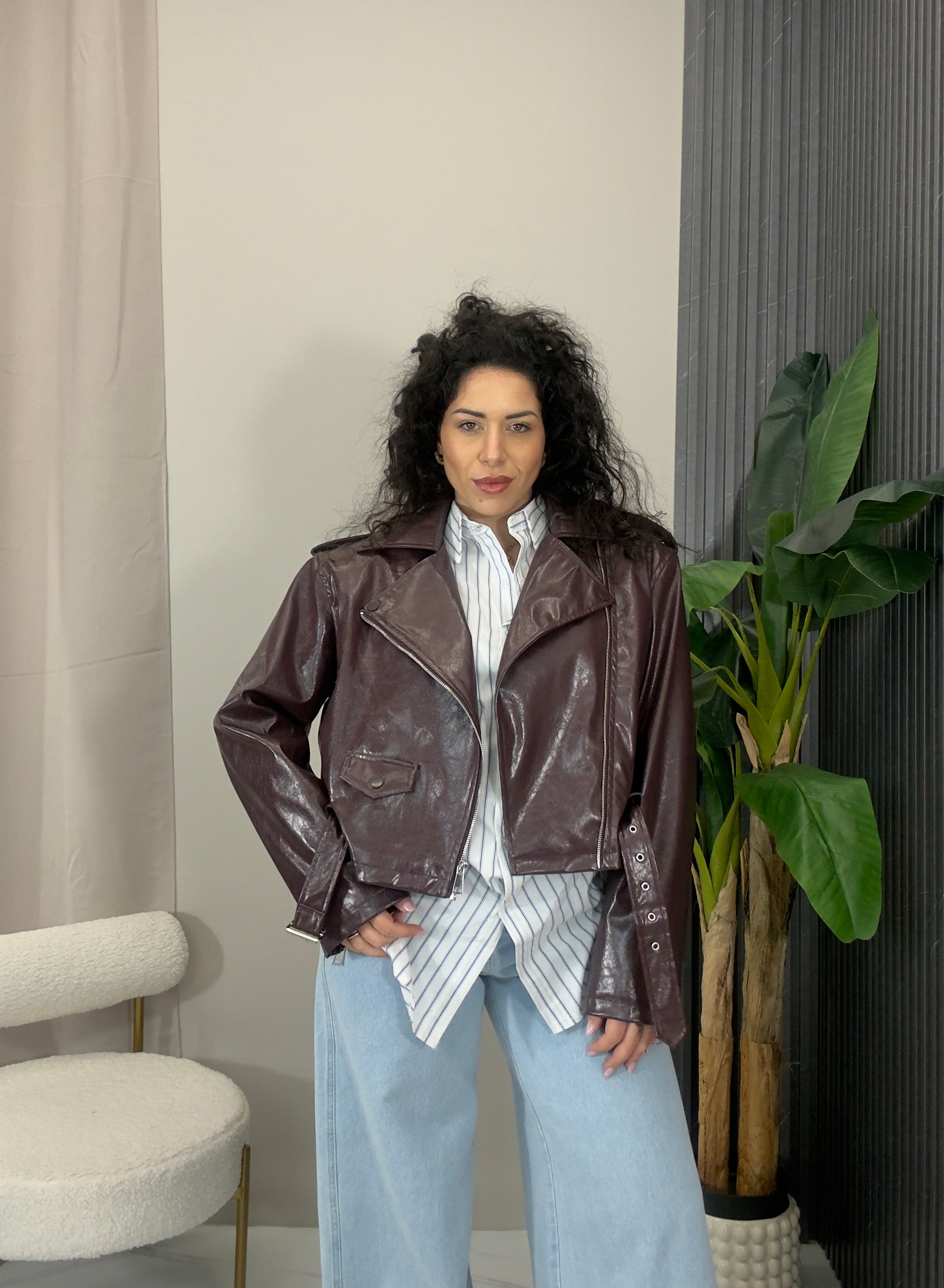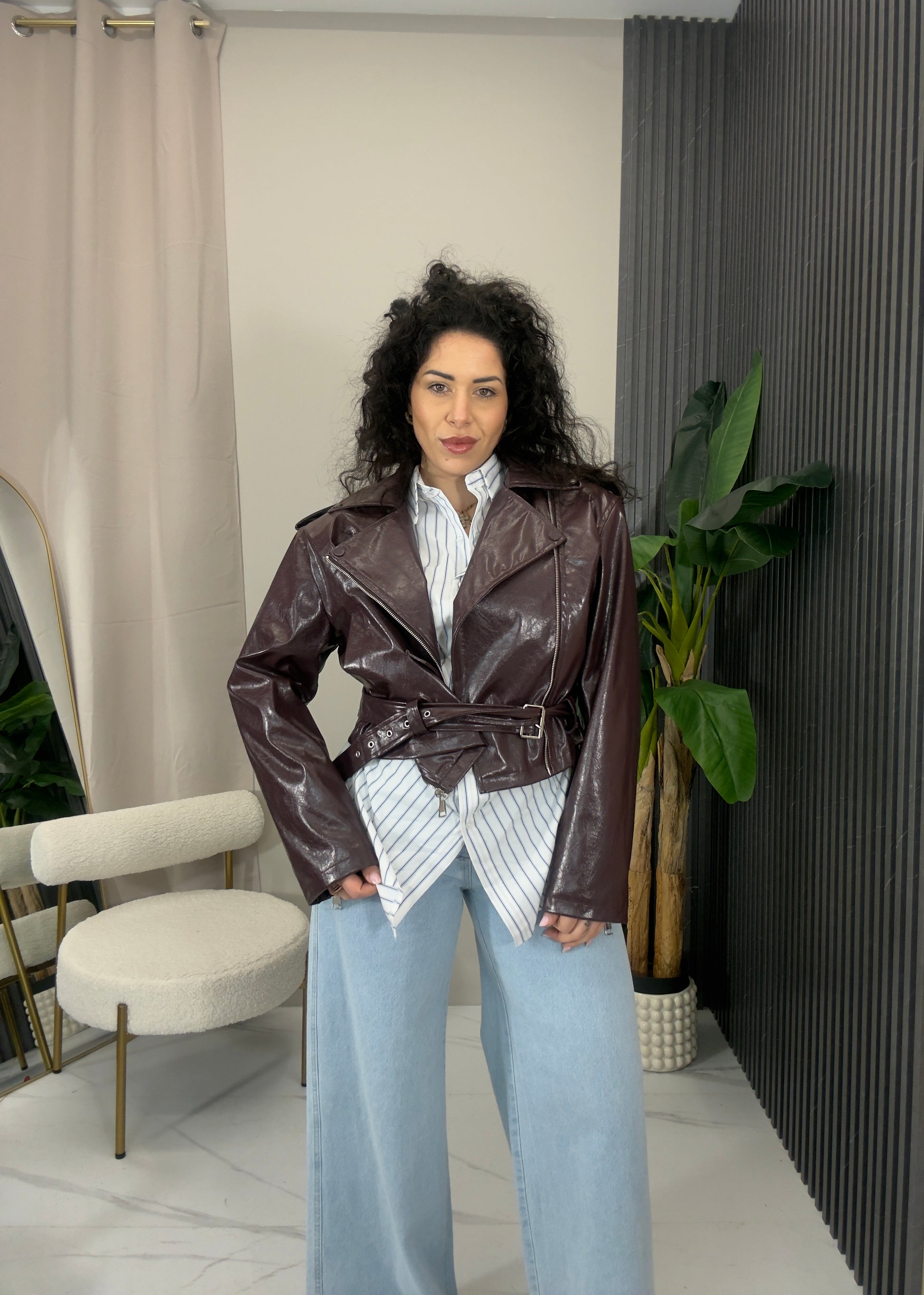 Giacca casual in pelle modello Over  con manica morbida e cinta in vita.