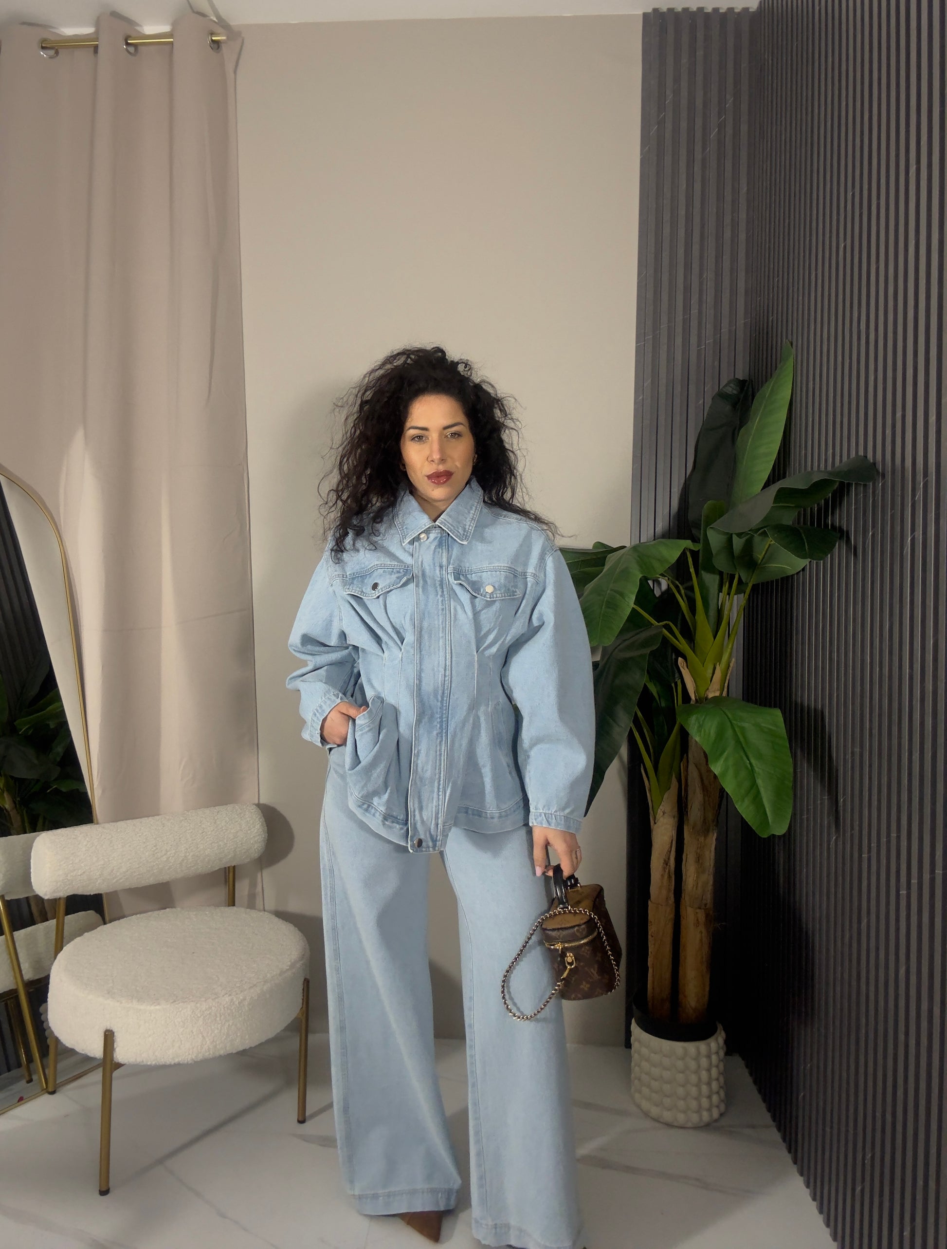 Giacca in jeans con cerniera, avvitata sul punto vita e sui fianchi, morbida sul sedere e ampia sulle spalle.