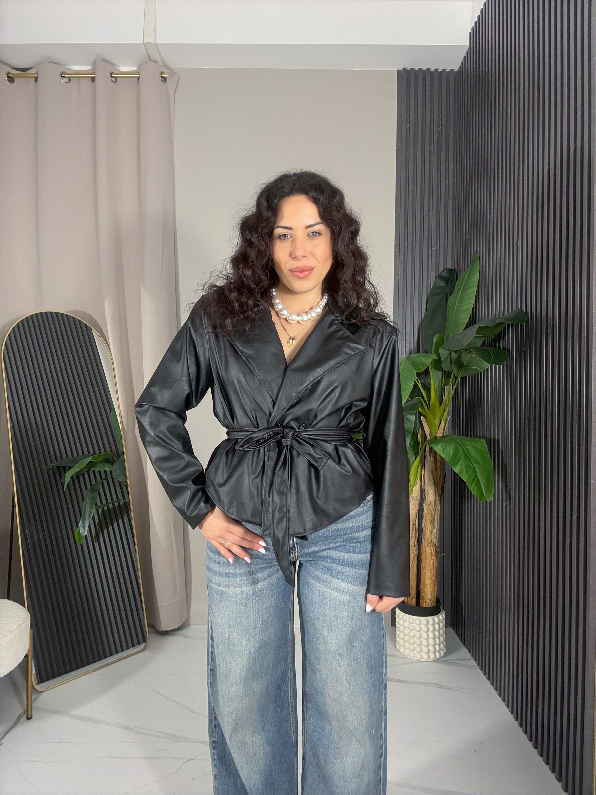 Giacca corta in pelle con spalline imbottite che donano struttura e stile, chiusura con un bottone sopra il sedere per un dettaglio originale. Modello versatile e di tendenza, perfetto per look casual o serali.