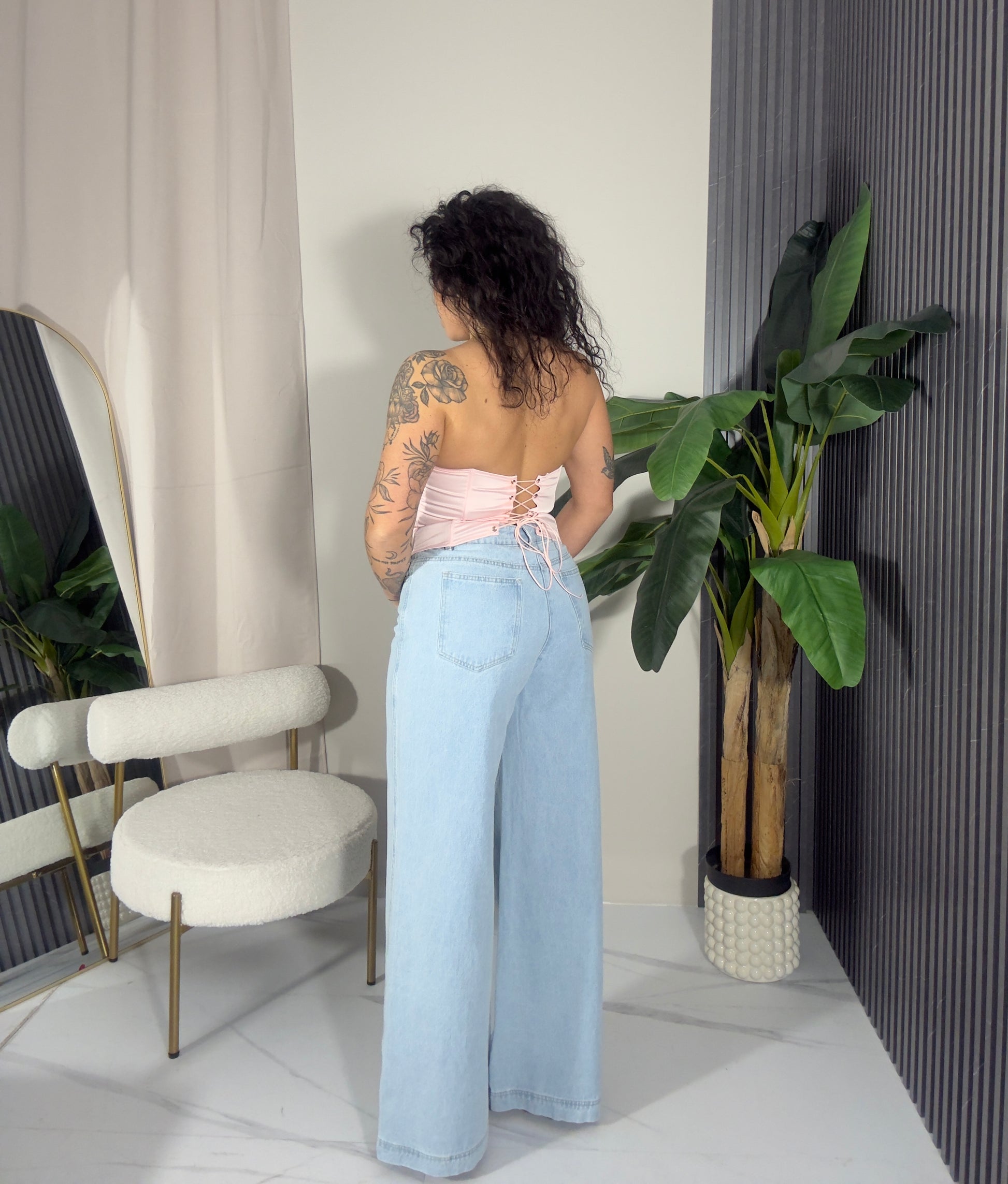 jeans wide leg in denim chiaro, disponibile in taglia s,m,L.