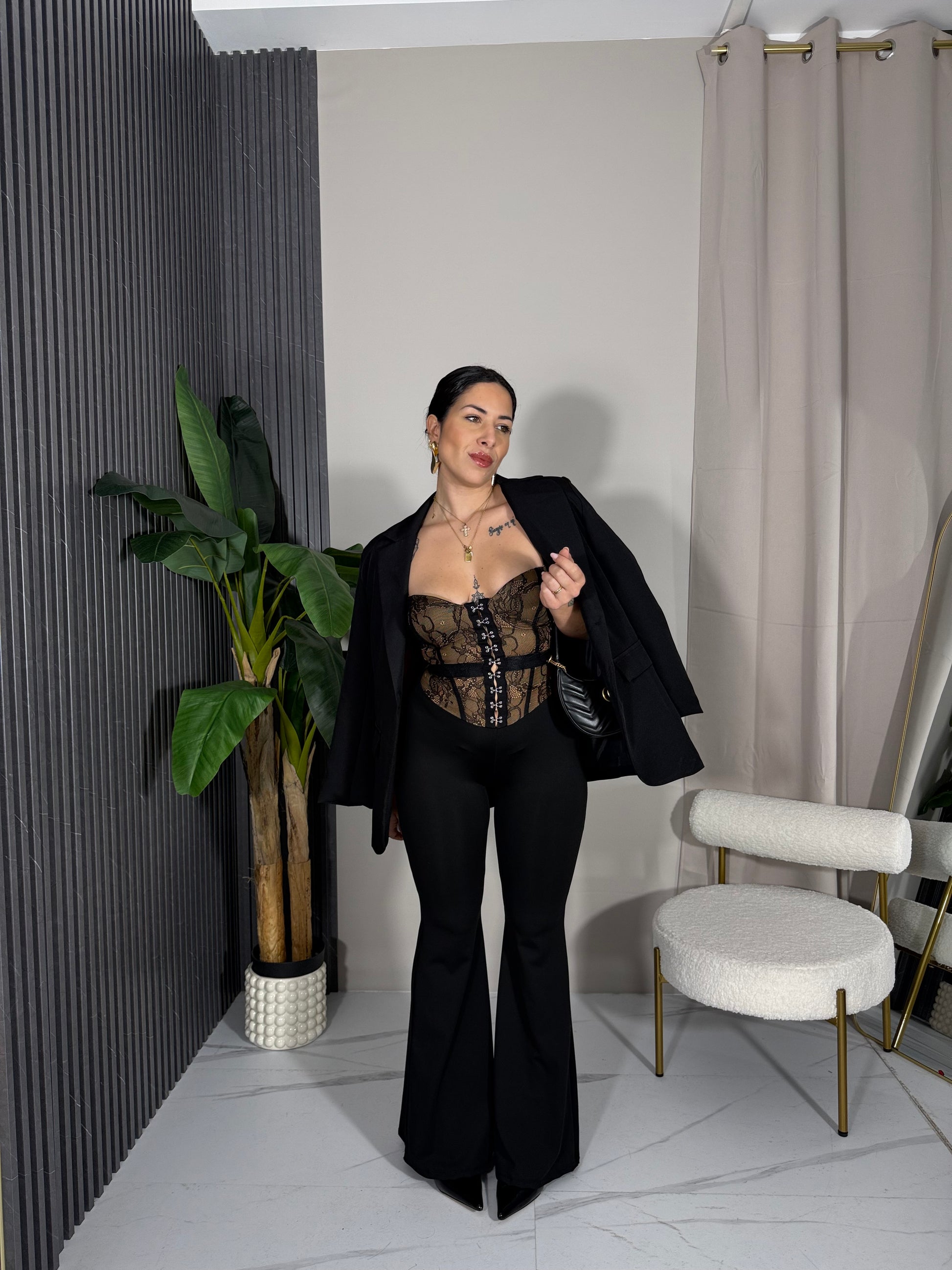 Tuta intera elasticizzata con pantalone a zampa.