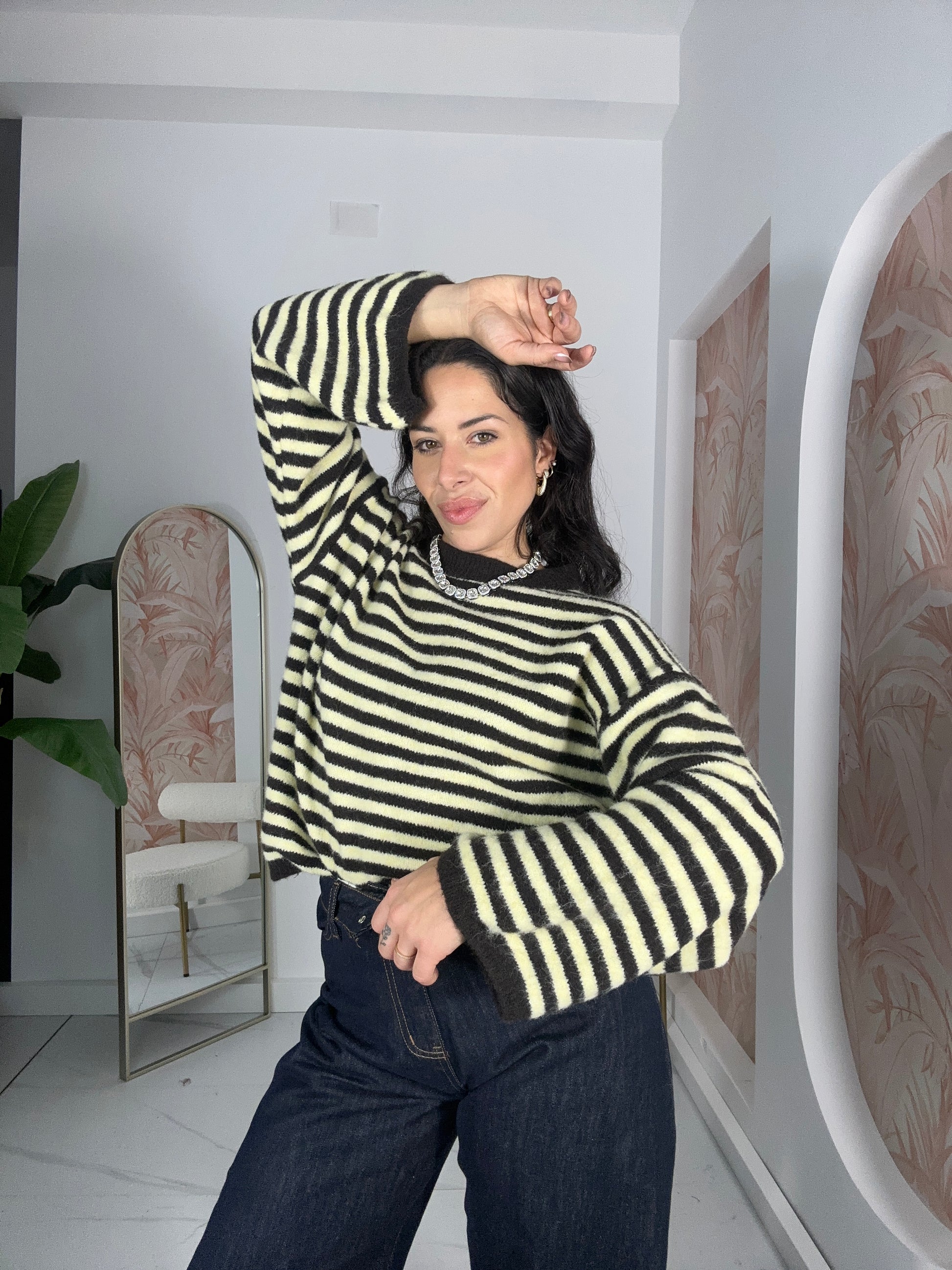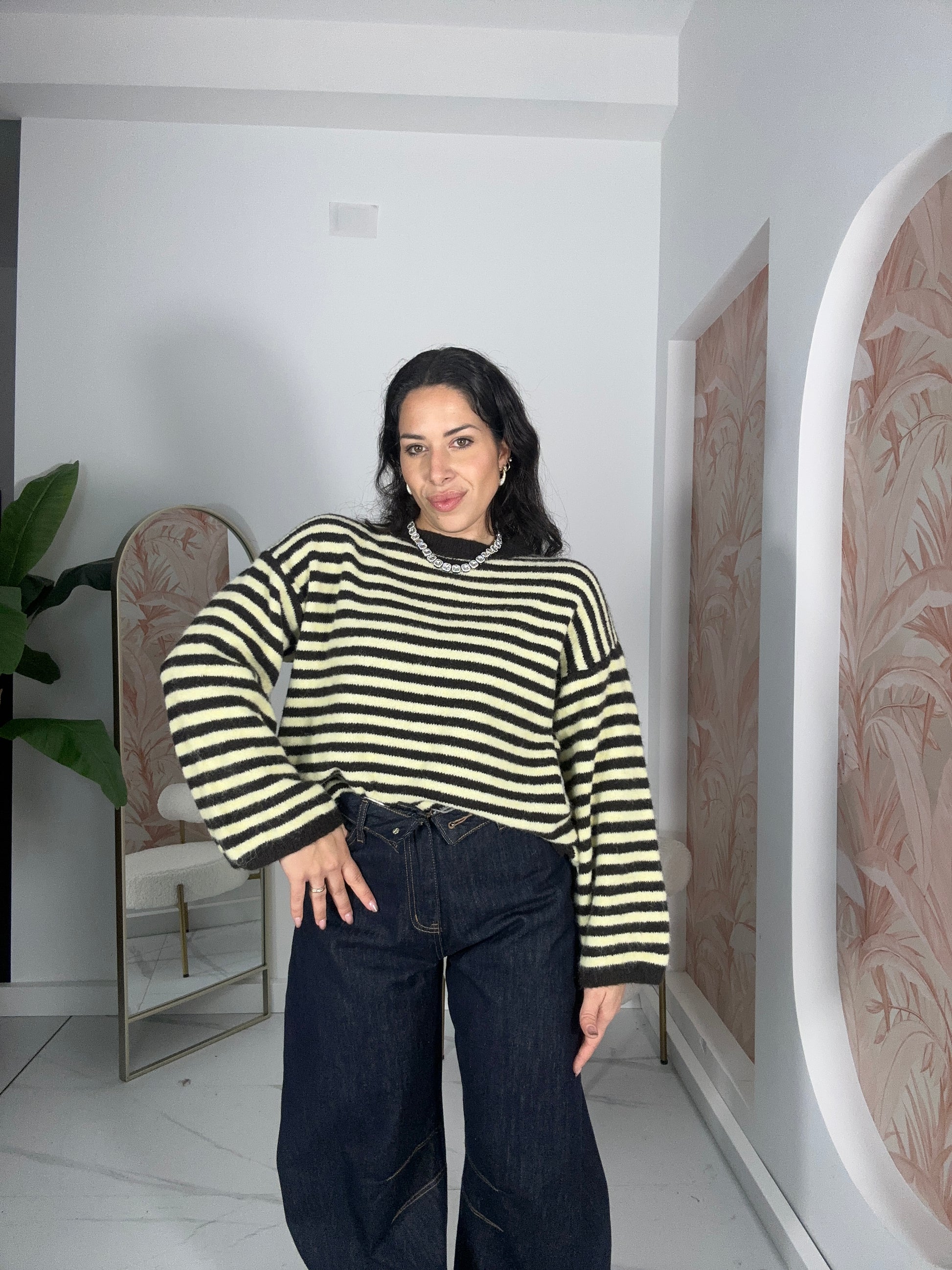 Maglione a righe in giallo e marrone scuro. Taglia unica