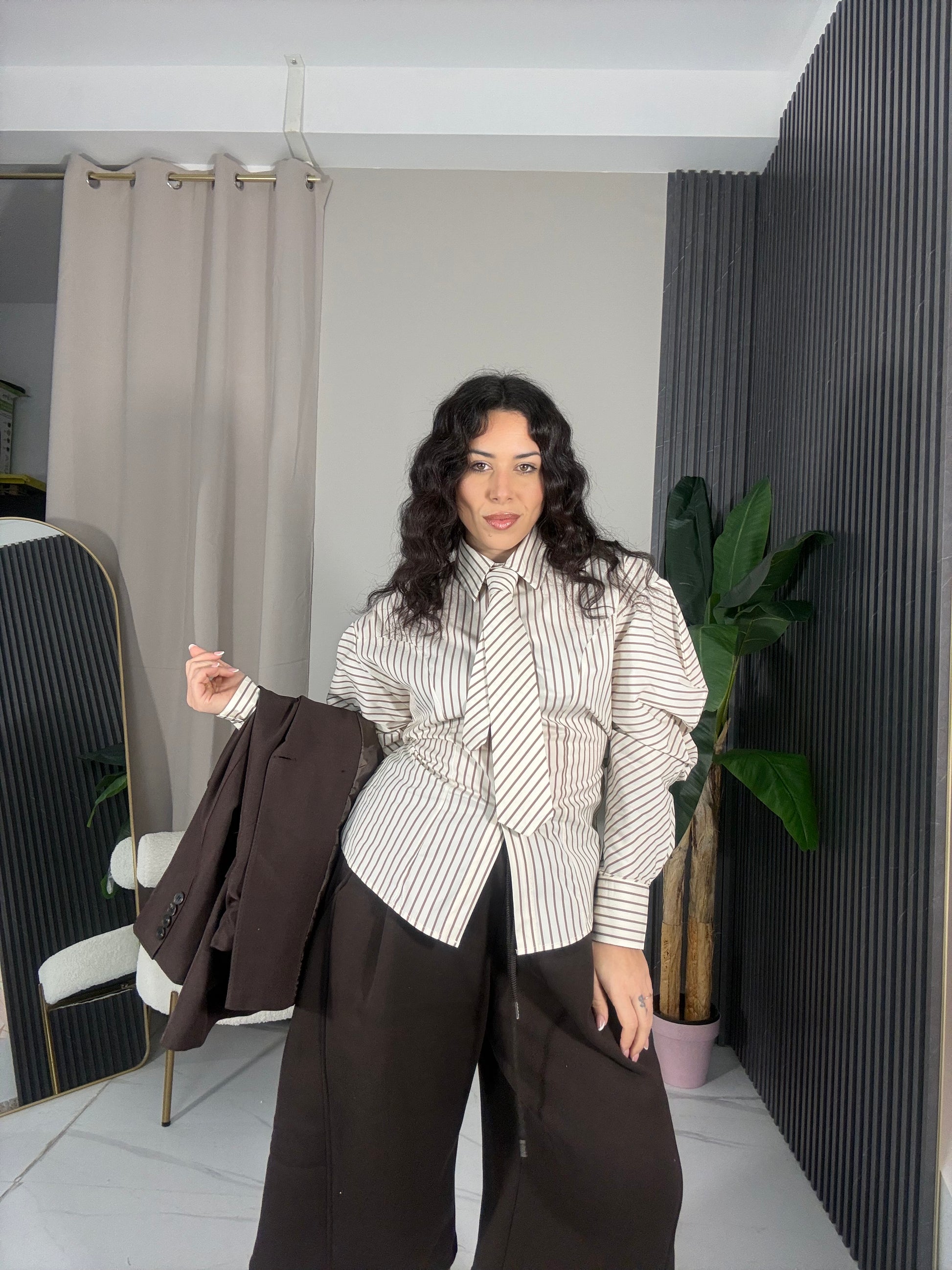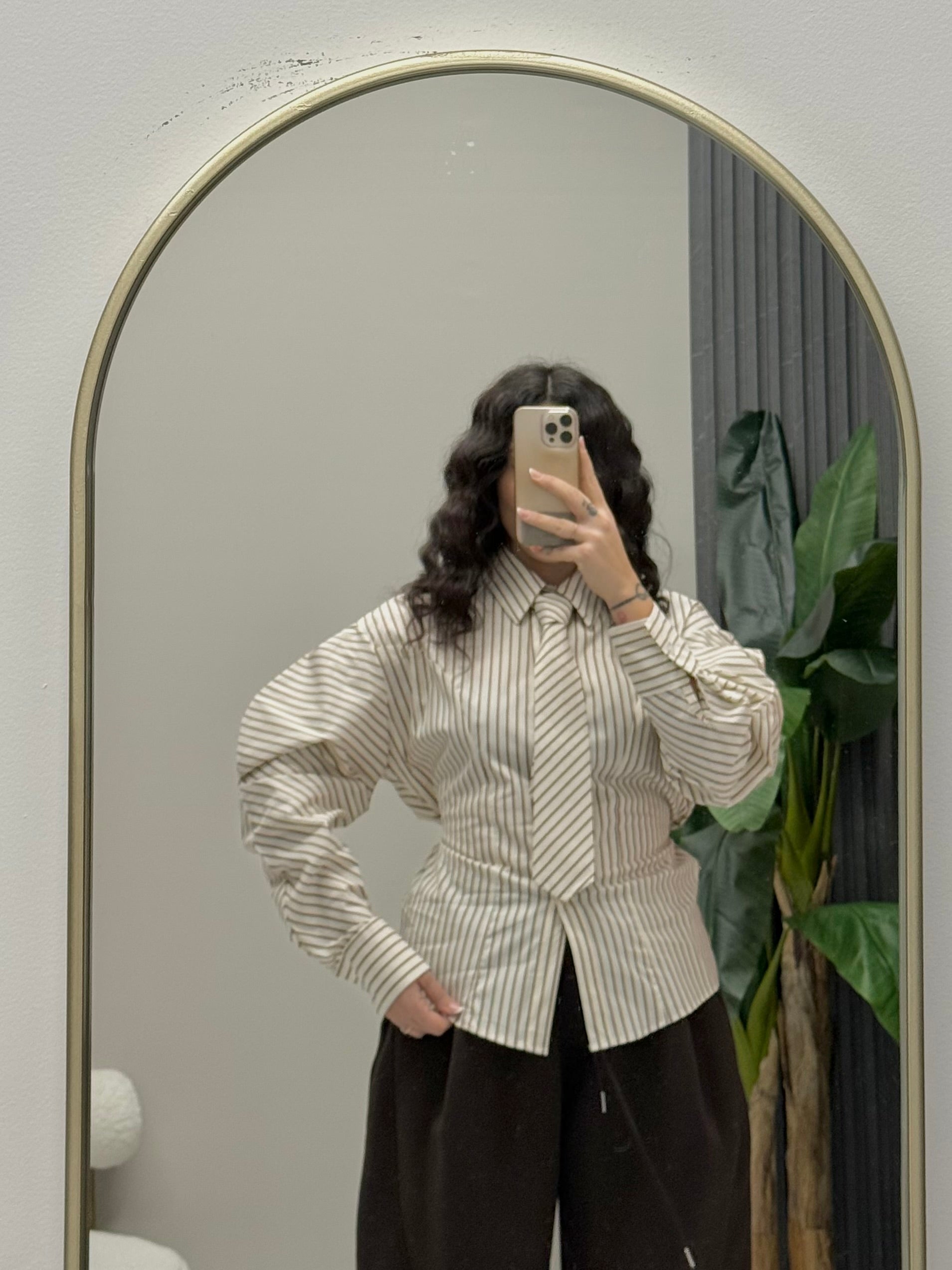 Camicia con manica particolare a sbuffo e cravatta. Grazie alle Due fascine sul retro può essere regolata sul punto vita.
