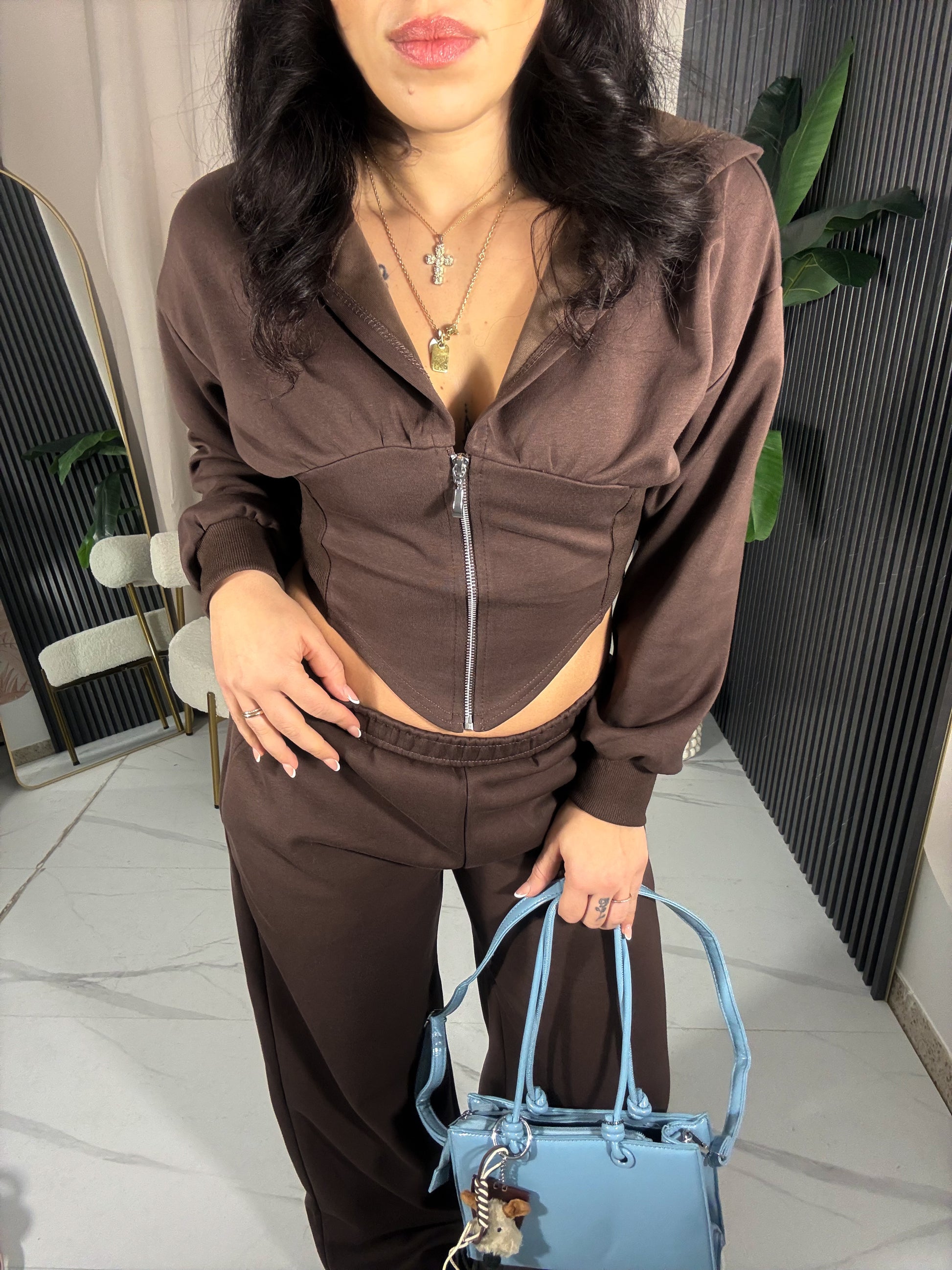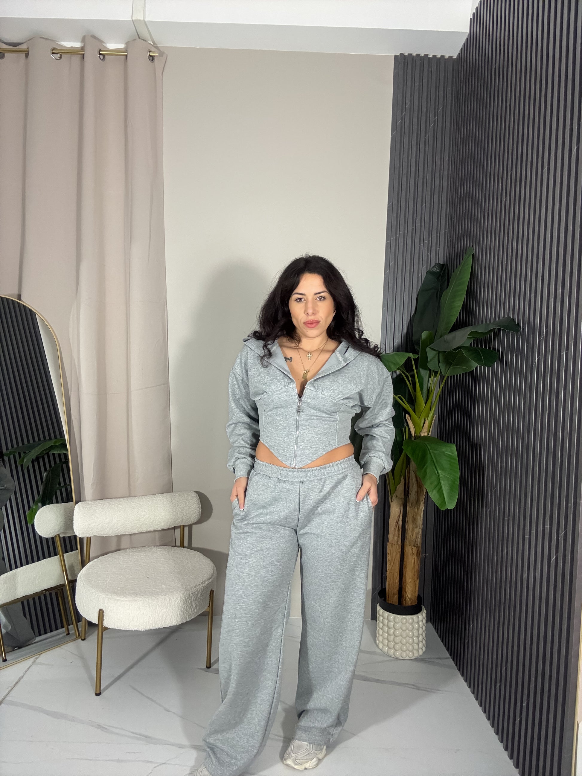 Coordinato tuta in Taglia unica con felpa crop asimmetrica con cappotto e cerniera lampo, il pantalone è dritto con L’elastico in vita.