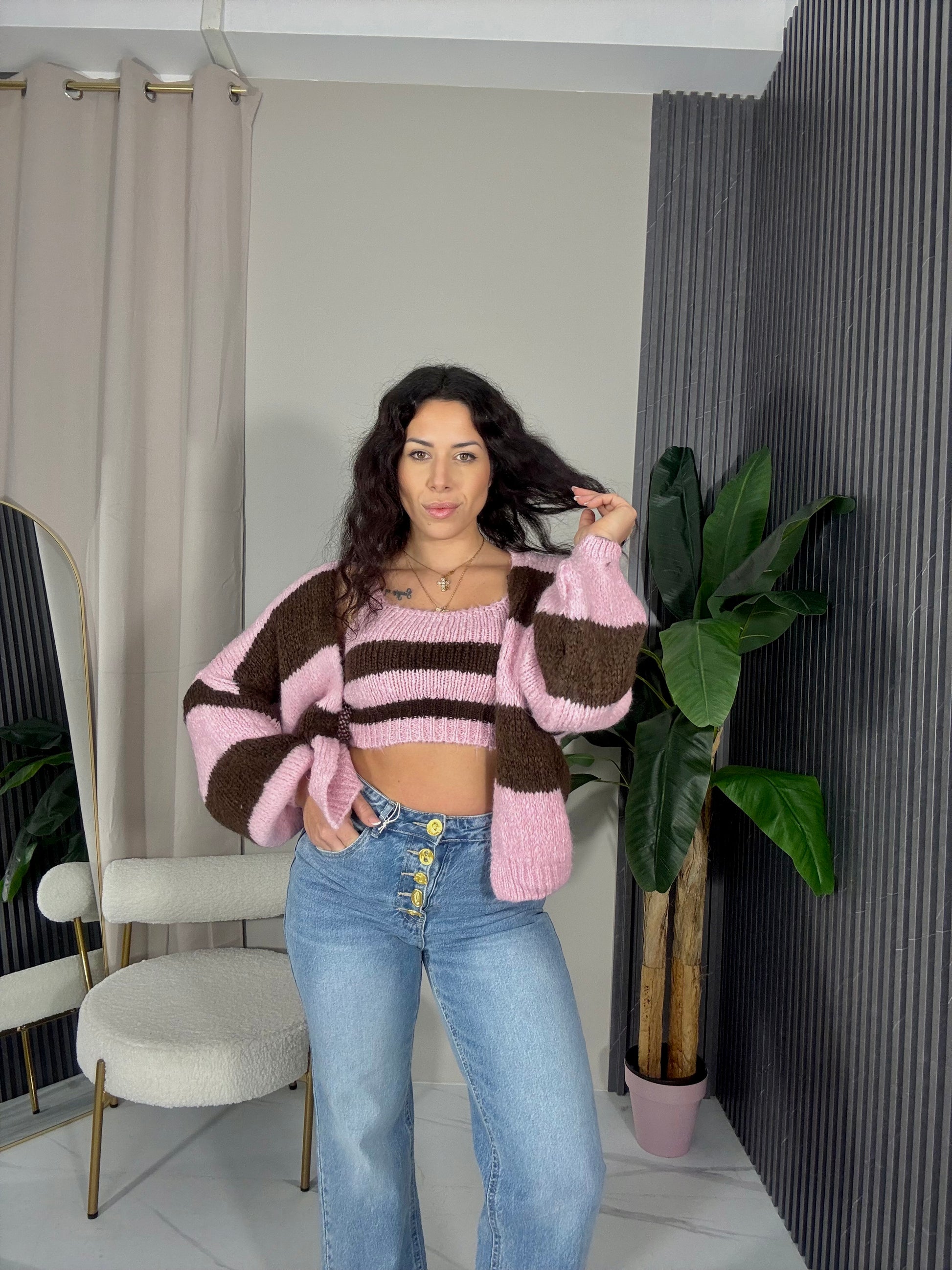 Set di cardigan e top a bretelle corti a righe rosa e marrone.