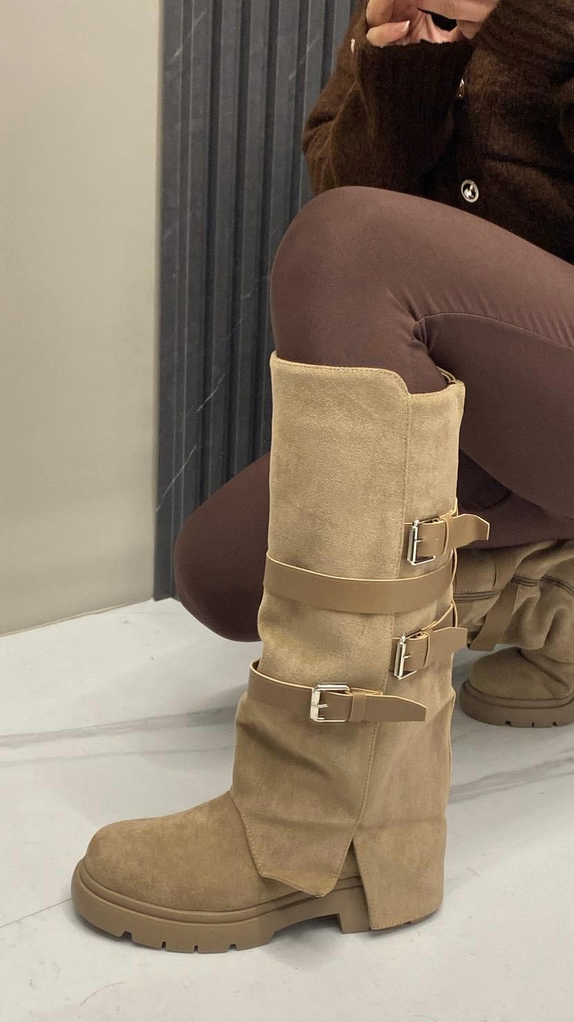 Stivale in camoscio beige con para dritta. Le fibbie sono regolabili.