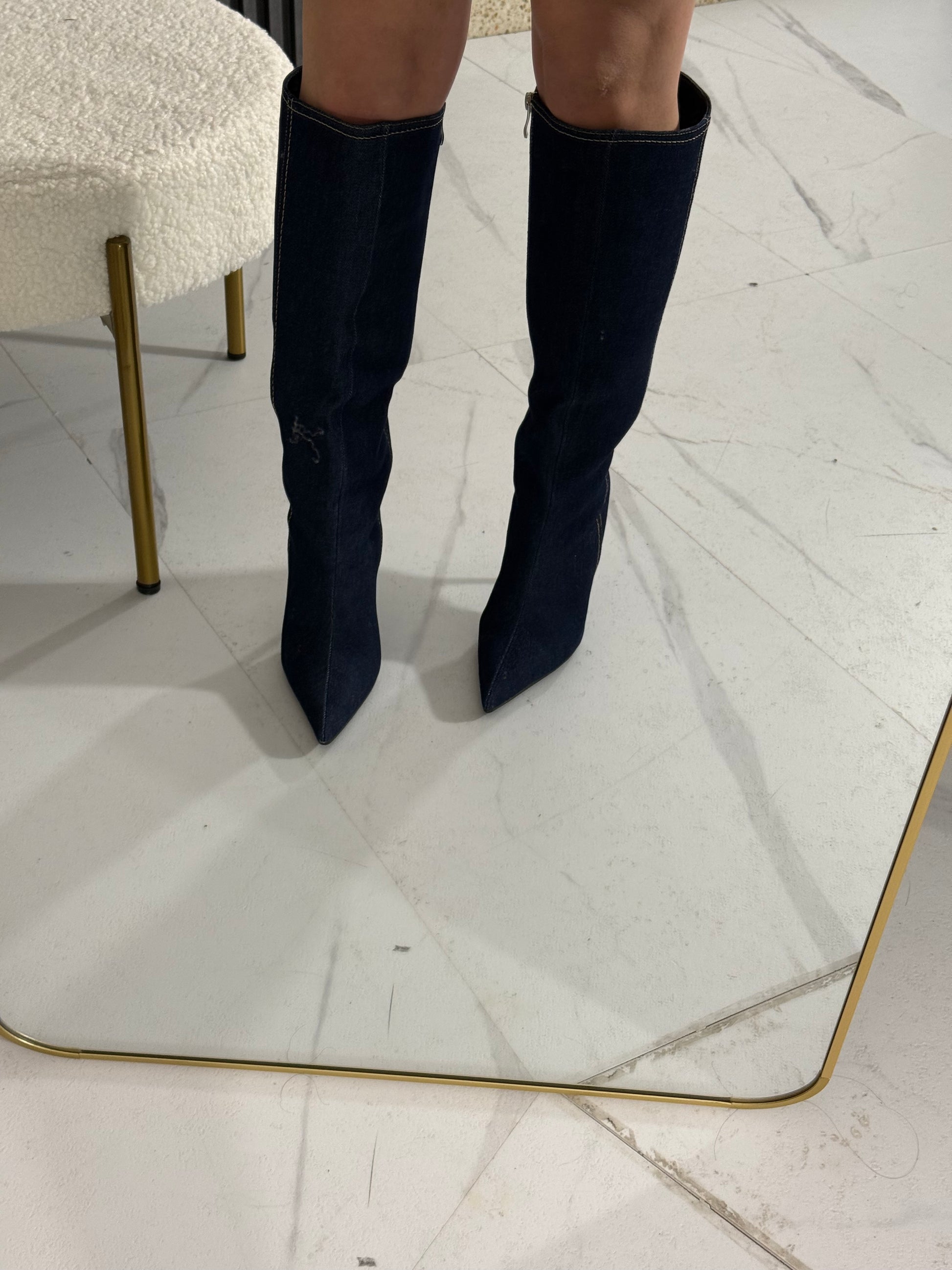 Stivale in jeans scuro con gambale morbido, altezza tacco 10 cm, cerniera lampo laterale.