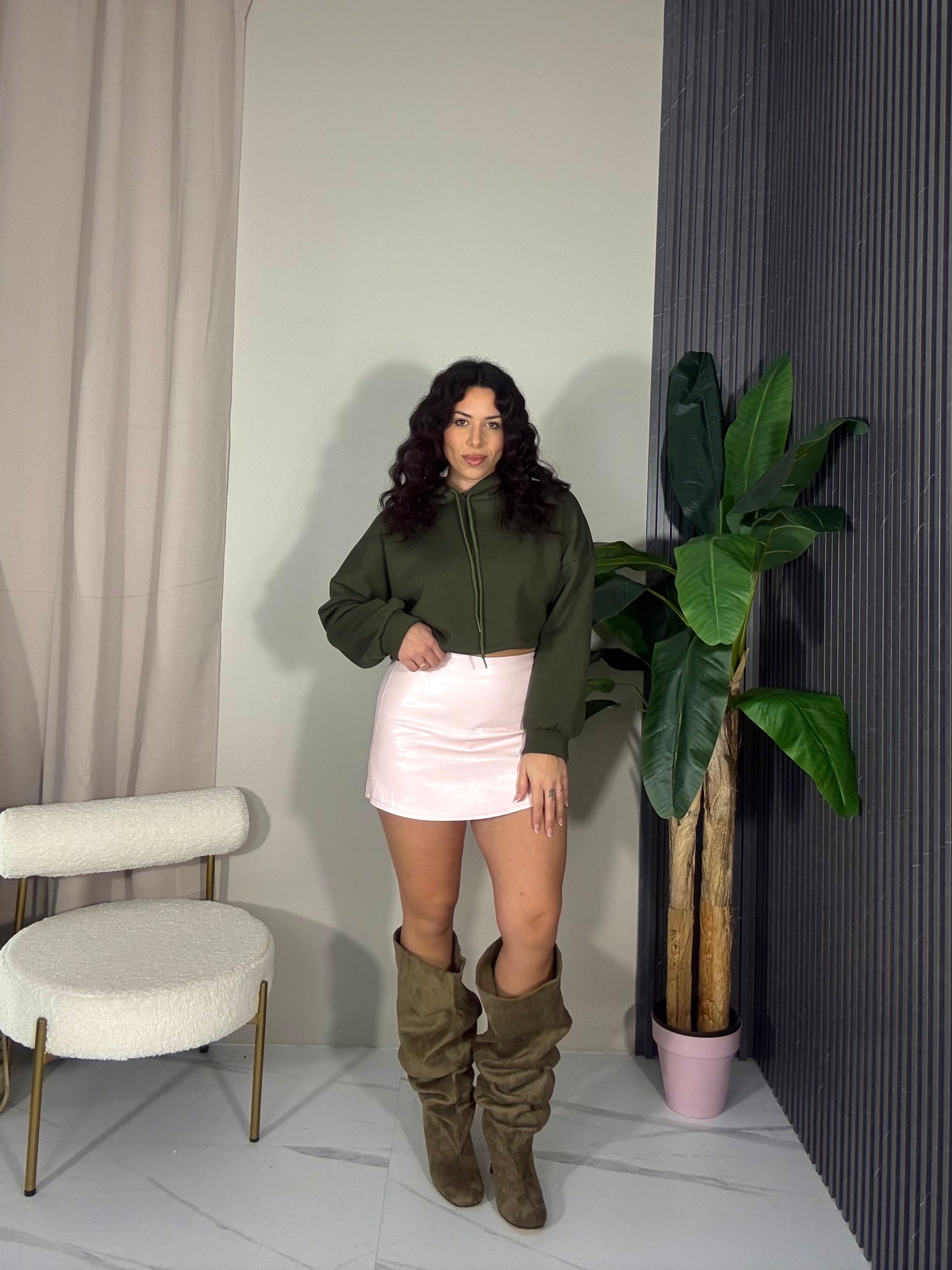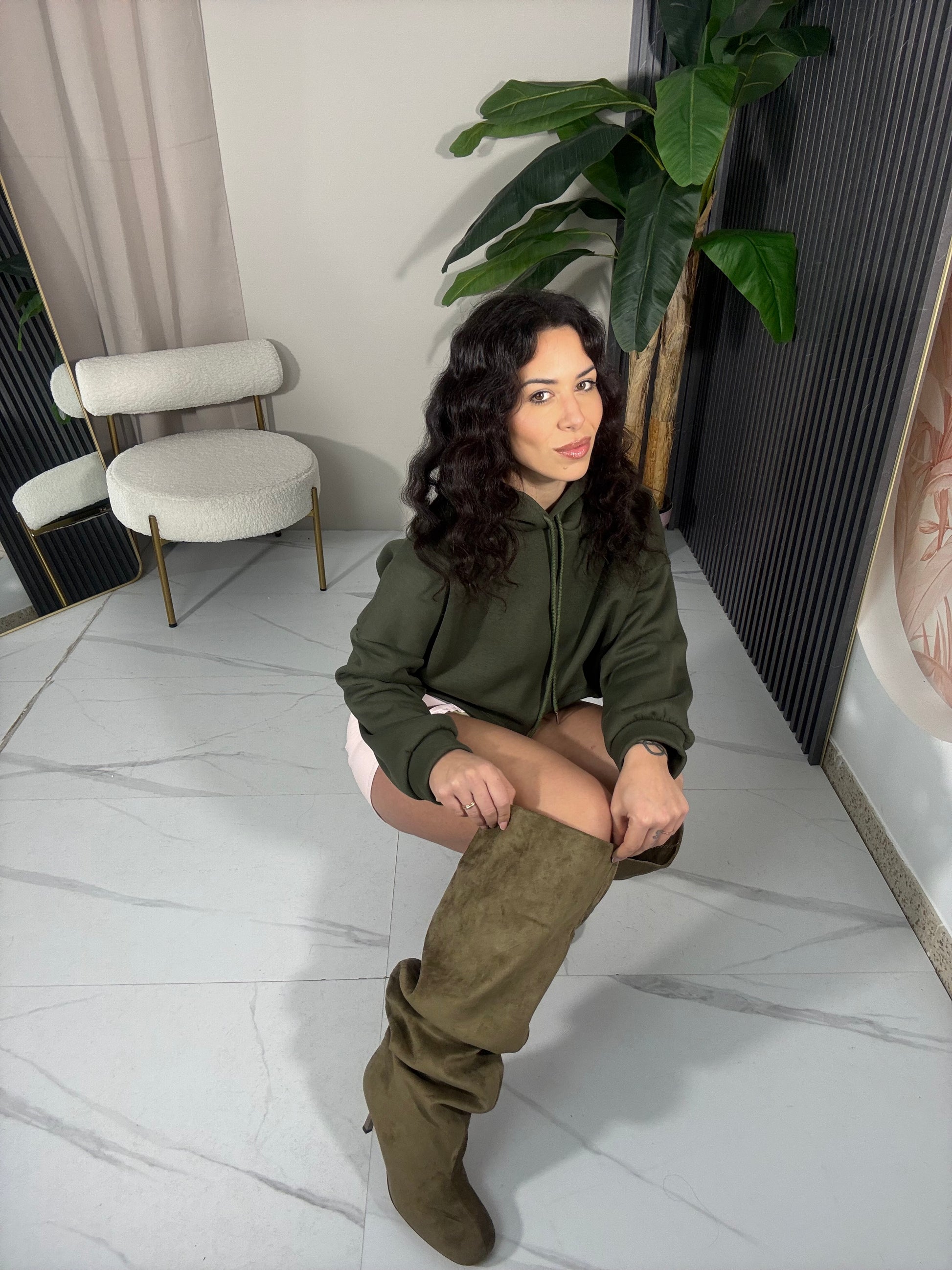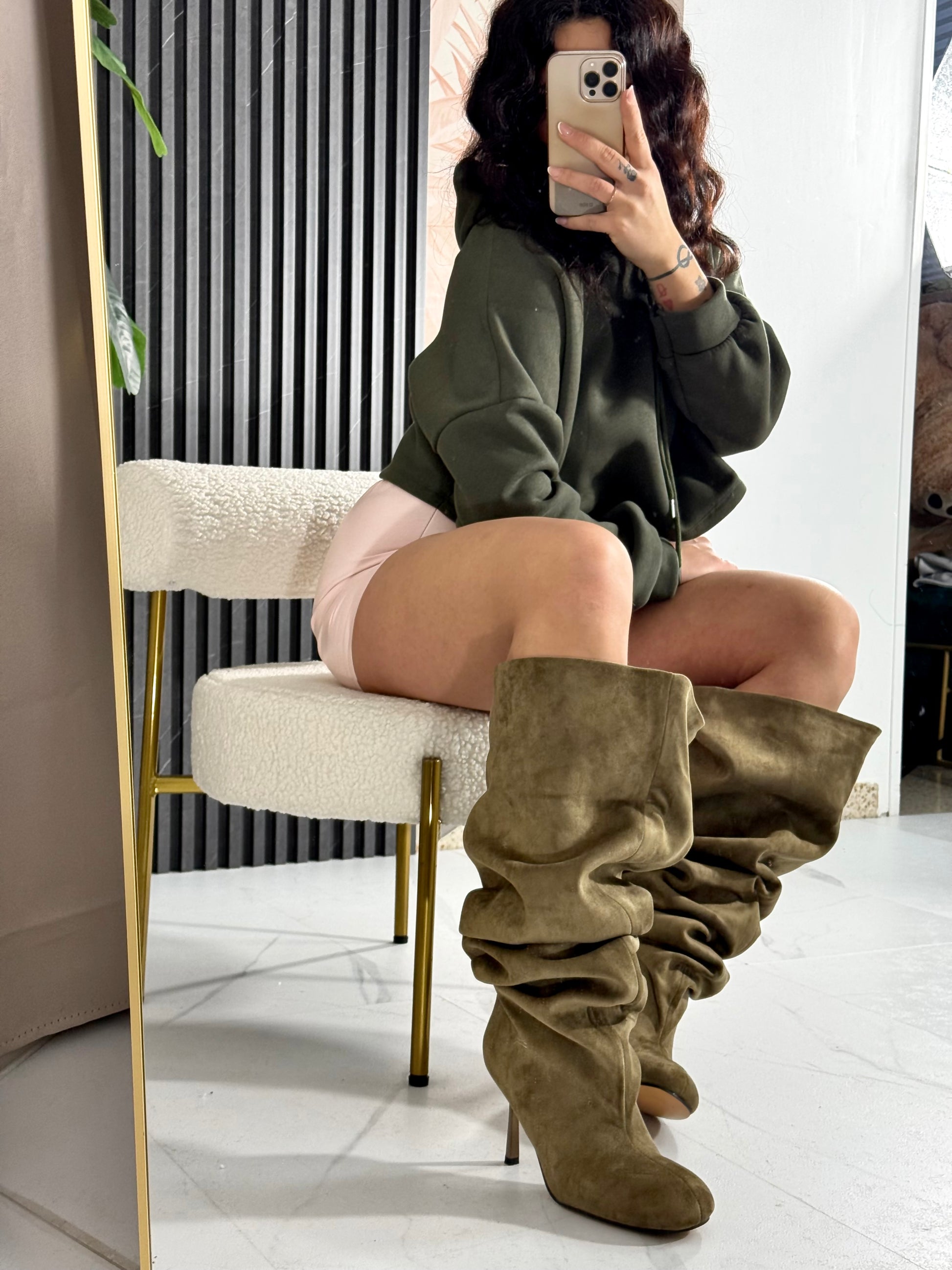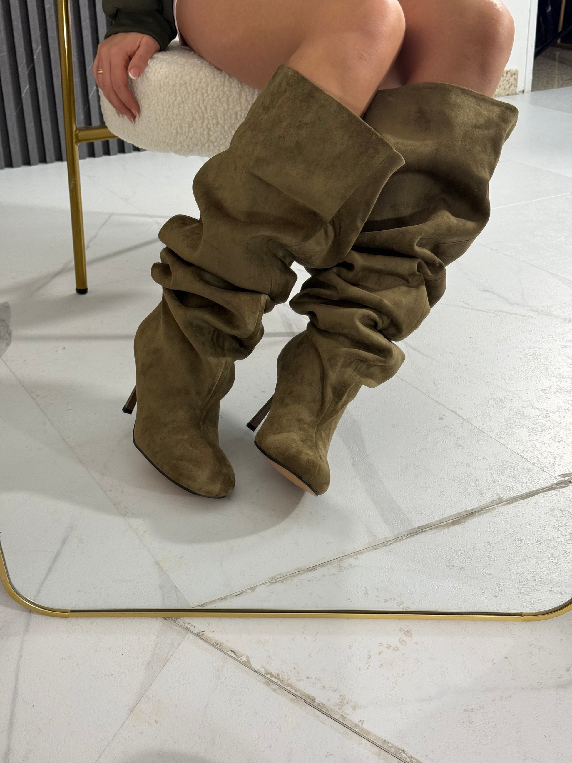 Stivale alto con gambale morbido e largo. La punta è quadrata e il tacco è alto 10 cm.