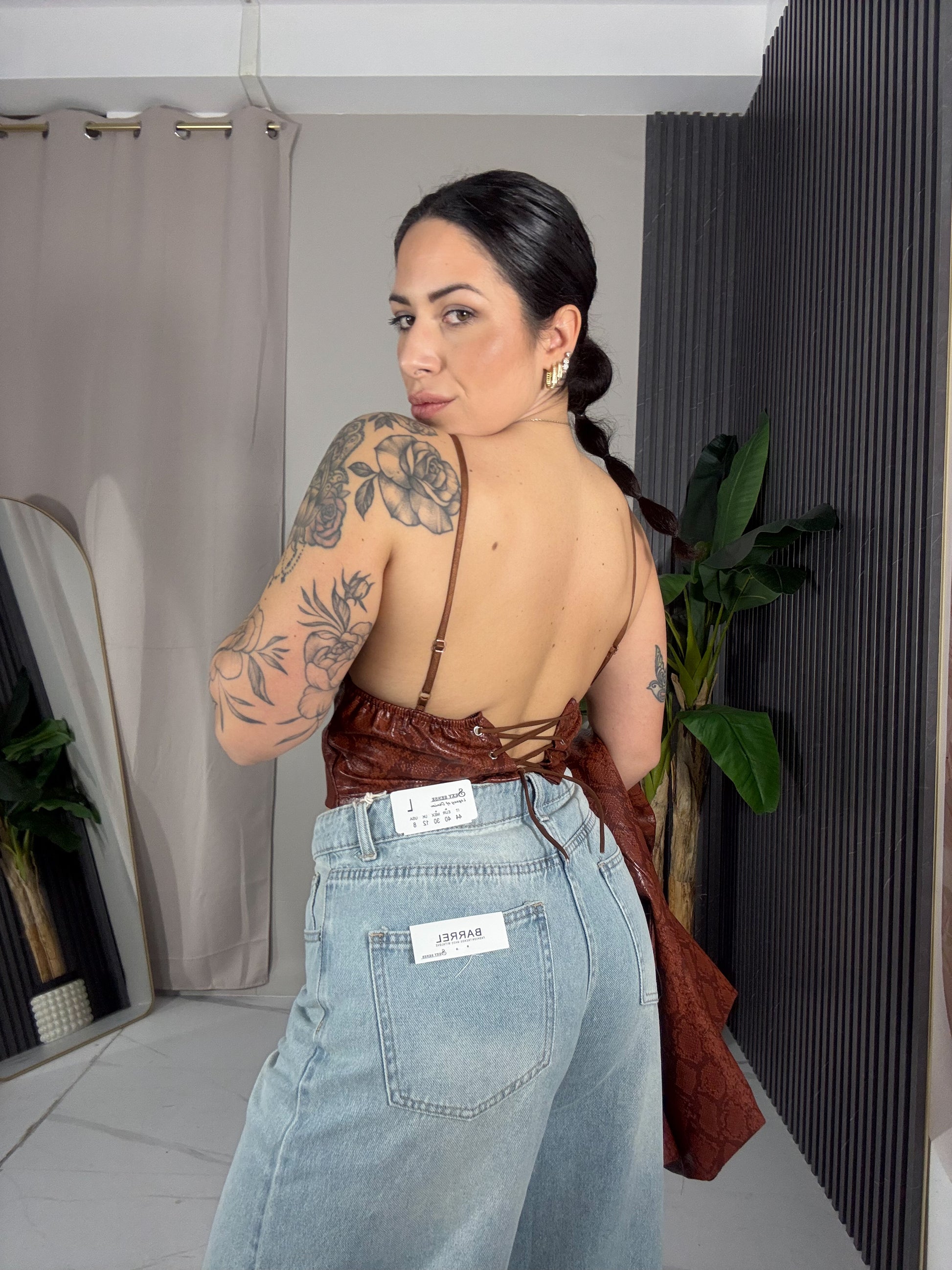 È abbinato al blazer pitonato modello Over con cintura in vita