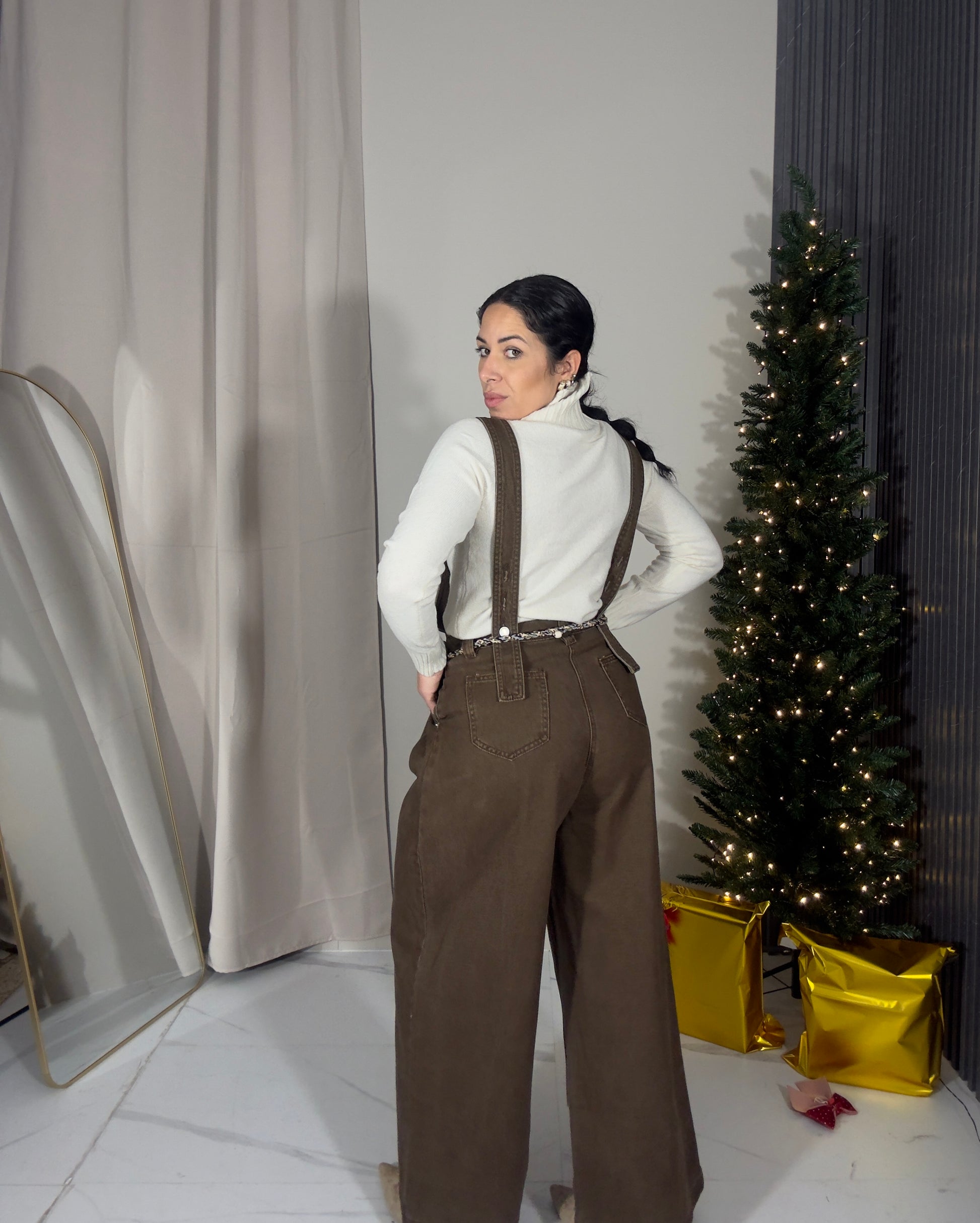 Salopette in denim rigido, con pantalone palazzo.